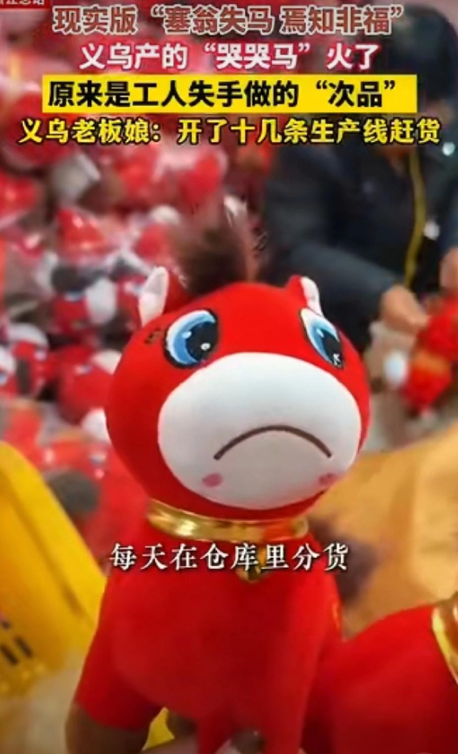 义乌“哭哭马”爆火! 谁能想到,一个“失误”竟造出2026马年第一顶流!义乌老板娘的经历太魔幻——工人不小心把马年玩偶的嘴巴缝反了,原本该微笑的小马,变成了委屈巴巴、泪汪汪的“哭哭马”,结果直接从次品逆袭成全网疯抢的爆款,老板娘连夜开十几条生产线赶货,网友笑称:“在义乌,连失误都能变现!” 这只“哭哭马”真的长在大家的萌点上:下垂的嘴角、软塌塌的耳朵,一副“我好难但我不说”的模样,精准戳中了当代年轻人的情绪——加班累了、提案被否了、生活压力大了,看到它就像看到了委屈的自己,瞬间共情。比起那些完美的微笑玩偶,这种“不完美的真实”反而更讨喜,网友调侃:“这哪是买玩偶,是买了个情绪搭子!” 其实“哭哭马”能爆火,不止是运气,更离不开义乌的硬核实力。从发现爆款潜质到开动十几条生产线,没有冗长的流程,全靠老板娘的敏锐嗅觉和义乌成熟的供应链,这才把一个小失误变成了大商机,完美诠释了“世界超市”的灵活与高效 。马年本来就不缺生肖玩偶,可“哭哭马”凭着独特的情感共鸣,在同质化产品里杀出重围,也印证了现在的年轻人更吃“走心”这一套。 现在“哭哭马”已经成了社交新货币,有人把它放工位当“摸鱼搭子”,有人送朋友当“解压礼物”,甚至还有人给它配了“打工人文案”。不得不说,义乌老板太会抓流量了,这波“化失误为神奇”的操作,简直是创业教科书! 你被“哭哭马”萌到了吗?如果是你,会买这只委屈巴巴的小马吗?来评论区聊聊,说说你心中的马年爆款该是什么样~ 义乌哭哭马爆火 马年生肖爆款 塞翁失马焉知非福 情绪搭子新宠