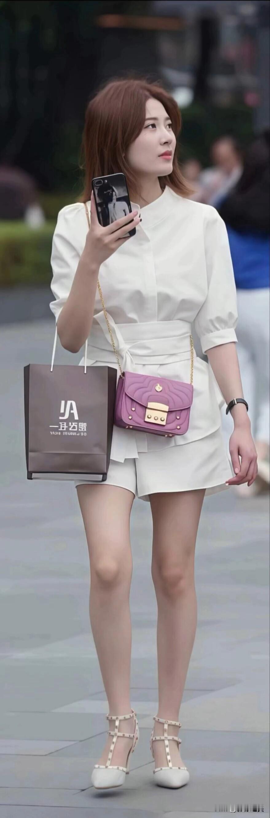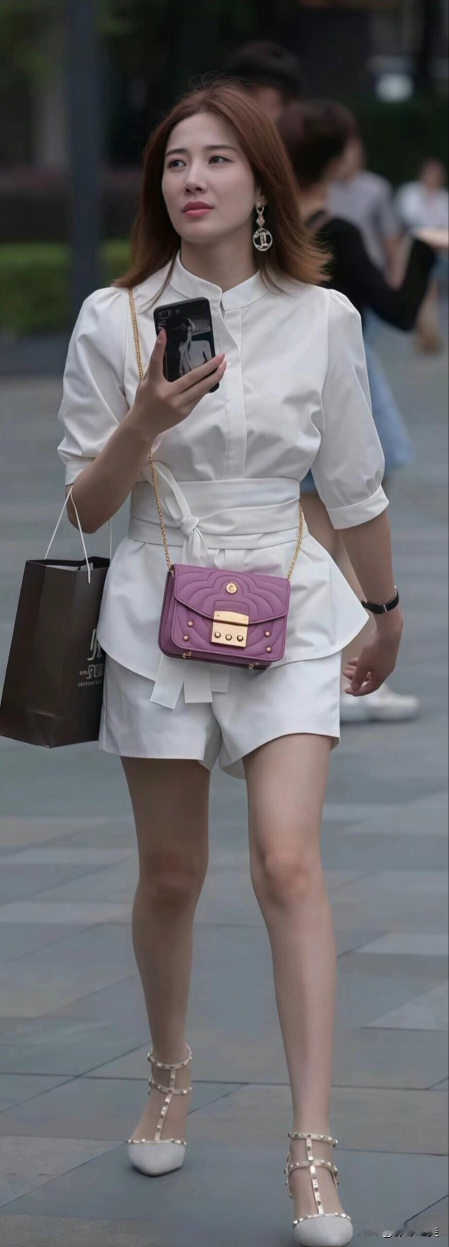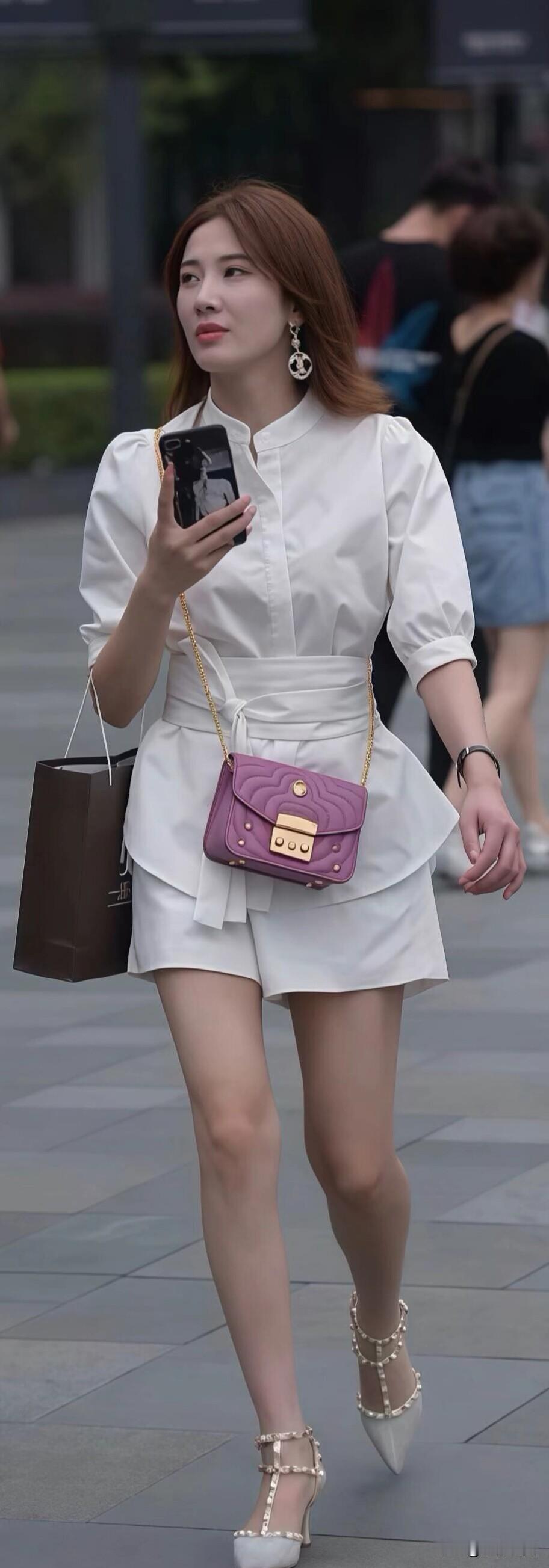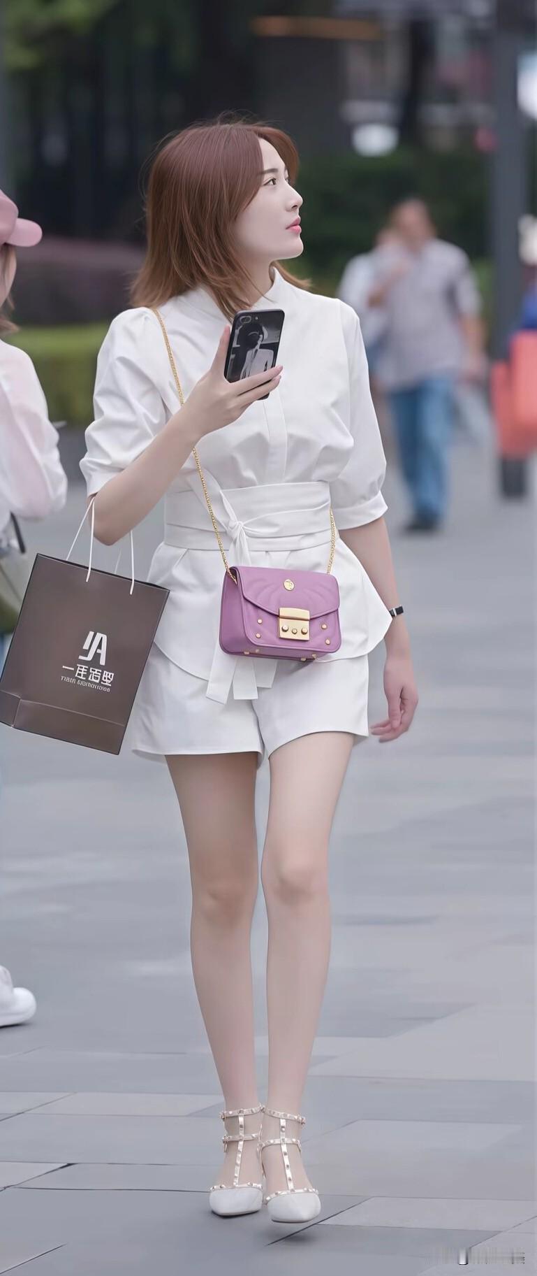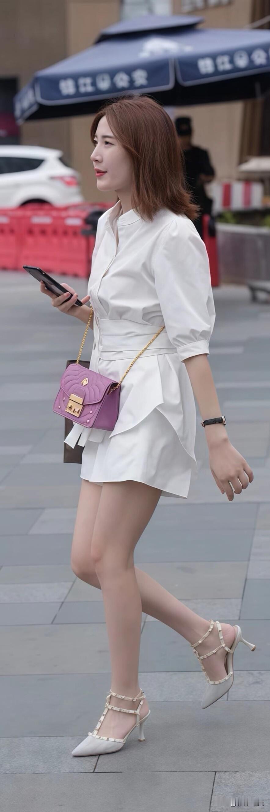 街头偶遇一位小姐姐,一身白色套装利落又显腿长,紫色小包当配饰,瞬间点亮了整体造型~