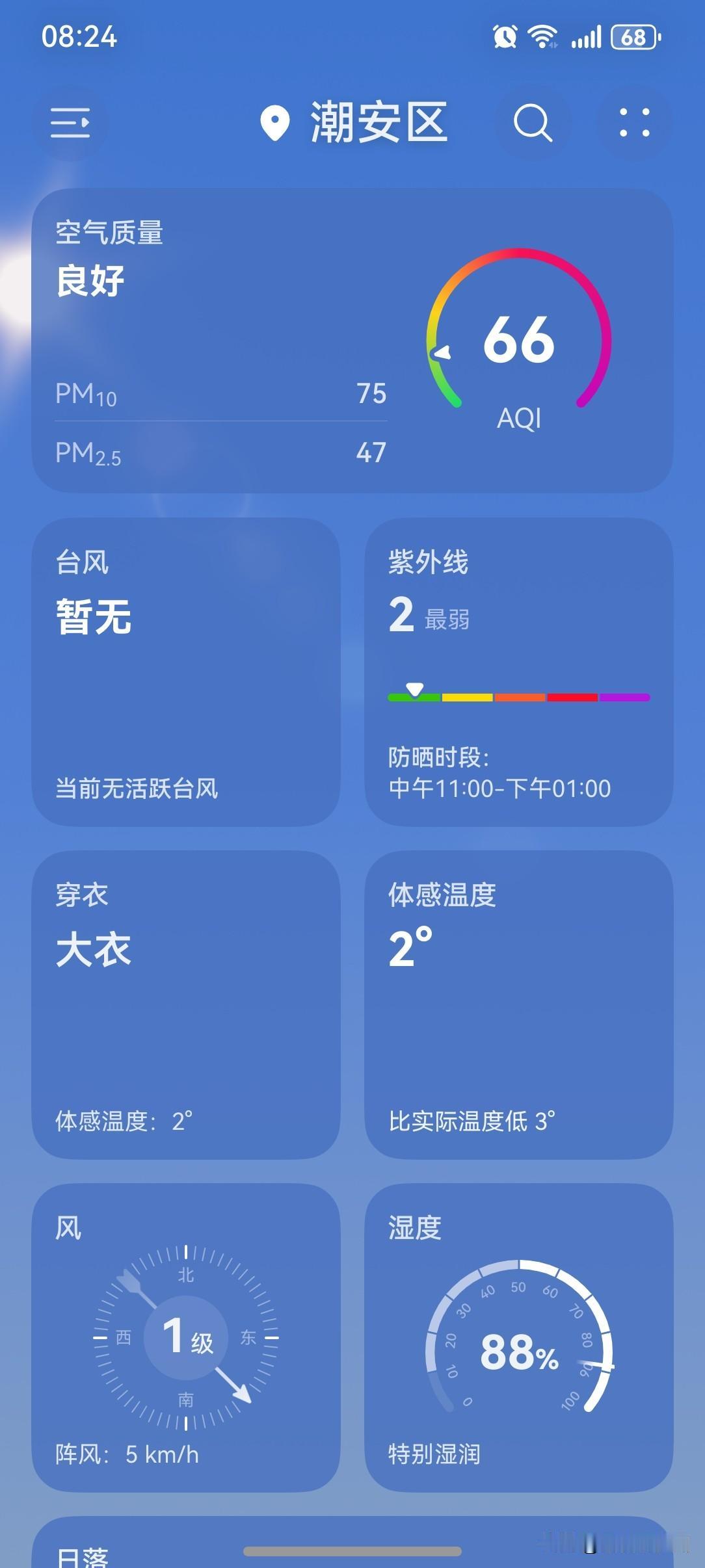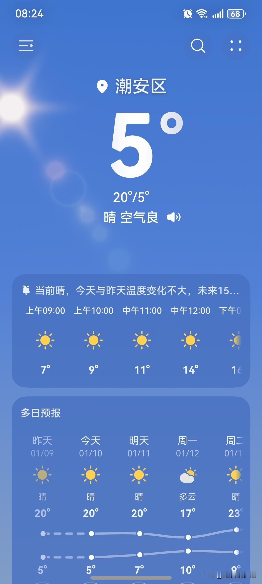 广东人早晚冻到腾腾震,11日又有弱冷空气补充影响,防寒保暖仍需做好。 今天(10日),广东大部晴到多云,气温缓慢回升,粤北市县仍有5℃以下低温,局部有霜冻;11日受弱冷空南下影响,我省大部晴间多云,我省海面东北风6~7级阵风8级;12日受高空槽前西南气流影响,珠三角南部和粤东市县多云到阴天,有分散性零星小雨,其余市县晴转多云。 今天(10日),潮州再次喜提一个大好晴天,气温5~20℃,此刻气温5℃,体感温度2℃。 已经连续被冻了好几天,总算是迎来了气温回升时刻。不过,早晚依旧寒冷,还是要注意添衣保暖。白天气温相对来讲还是比较高的,今天的全天最高气温比昨天再上升一点,重返20℃啦!又是白天暖洋洋,早晚冷冰冰的天气节奏!昼暖夜冷,就像今天,早晚温差相差了15℃啊! 一起来看看今天的天空吧!早上的天气画风依然是阳光灿烂,却又带着点薄雾,显得阳光没有那么明媚。 今天是周末,对于爱睡懒觉直接睡到日上三竿的人来讲,可能感受不到寒冷;但对于仍然坚持早起的人来讲,早上还是蛮冷的。 于是,同一天,同一个地方,会出现两种不同的说法:“今天一点也不冷!”、“今天还是有点冷!”果然,不同的人有着不一样的感受啊! 今天这样的天气,从整体来讲,依然值得拥有一个五星好评! 如此天气!元芳,你怎么看?