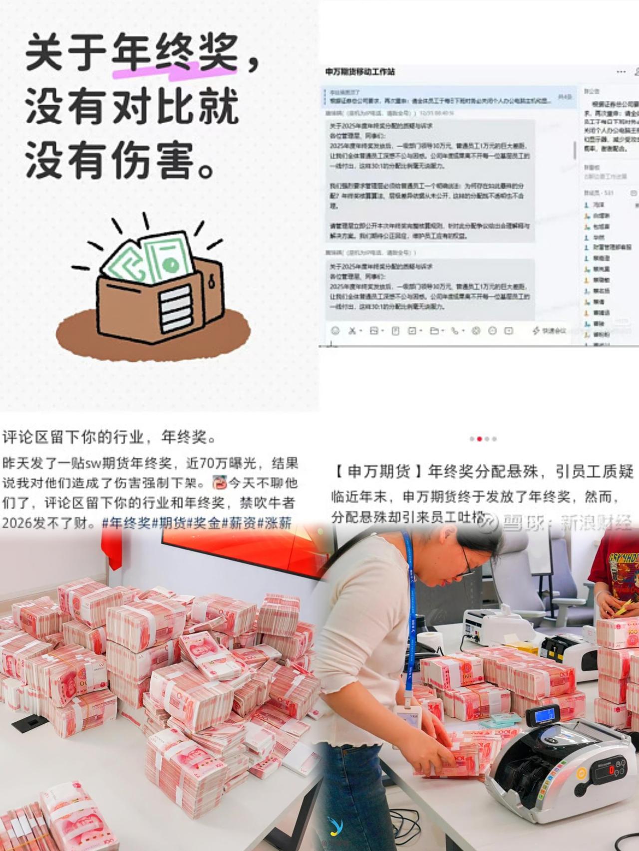 申万期货年终奖30倍差距引轩然大波!员工质疑遭停职,冲突报警立案 2025年末,申银万国期货有限公司年终奖发放引发全网热议:一级部门领导年终奖高达30万元,而普通员工仅得1万元,30倍悬殊差距戳中职场公平痛点 。更令人关注的是,公开提出质疑的老员工唐先生(化名)不仅未获合理答复,还遭遇企业微信账号被封、停职处理,与总经理沟通时发生肢体冲突,导致头外伤、面部挫伤,警方已立案调查 。 据当事人透露,他2021年入职申万期货,2021-2023年年终奖平均约4万元,2024年公司停发年终奖仅补发9000元过节费,2025年叠加季度奖缩水,全年收入降幅达45% 。其提供的转账记录显示,2025年12月31日收到的年终奖仅11763.24元,而经内部渠道确认,一级部门领导年终奖普遍为30万元左右 。他在531人企业微信群中要求管理层公开核算规则和层级差异依据,却无人回应。 值得注意的是,申万期货业绩并未陷入困境。公开数据显示,公司2022-2024年净利润均超2.5亿元,营收连续三年增长,2025年期货市场成交额同比增长23.74%,行业行情火热 。截至目前,申万期货及母公司申万宏源均回应称相关信息为“不实信息”,但未对分配规则、停职依据等核心问题作出明确说明,事件仍在调查中 。 这起事件引发广泛共鸣,网友纷纷吐槽“合理差距可接受,30倍已背离行业共识”,法律人士也指出,年终奖分配需遵循公平与按劳分配原则,企业不得随意设定标准。职场分配公平与员工合理诉求表达的边界问题,成为岁末年初热议的焦点。