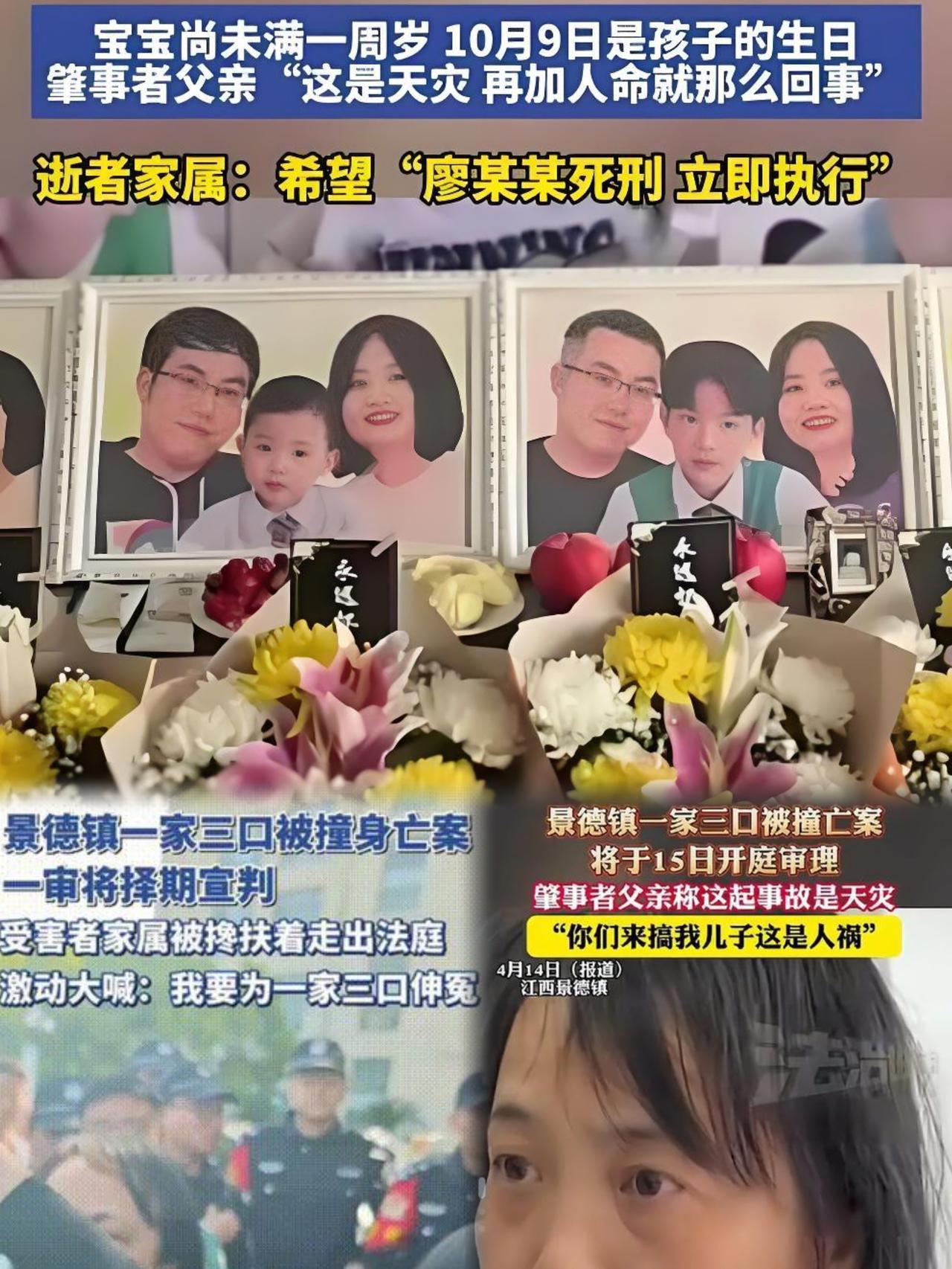 景德镇一家三口被撞身亡案一审宣判!肇事司机获死缓,受害家属将申请抗诉 2026年1月9日,备受全国关注的江西景德镇“一家三口被撞身亡案”一审落槌,景德镇市中级人民法院以以危险方法危害公共安全罪,判处被告人廖某宇死刑,缓期二年执行,剥夺政治权利终身 。这一判决距案发已过去15个月,受害人家属明确表示不接受该结果,将在法定期限内申请检察院抗诉 。 法院审理查明,2024年10月2日18时30分(国庆节假日晚高峰),20岁的廖某宇驾驶电动汽车与同车女友发生争执后情绪失控,在限速40km/h的景德镇昌江大道(城市主干道,人流车流密集)持续加速,最终车速飙至128.96km/h(超速200%) 。当他发现正在横过马路的胡某(31岁)、王某某(30岁)夫妇及怀中不满1岁的幼子后,虽采取紧急制动和打方向避让,但因车速过快仍发生猛烈撞击,导致三名被害人先后死亡,其中幼童当场殒命 。案发后,廖某宇拨打了急救和报警电话并在现场等候,构成自首情节 。 庭审焦点集中在定罪与量刑上:检察机关以“以危险方法危害公共安全罪”提起公诉,而廖某宇仅认可“交通肇事罪”指控。法院最终认定,廖某宇在人员密集路段严重超速行驶,其行为已对不特定多数人安全构成重大威胁,符合“以危险方法危害公共安全罪”构成要件,且犯罪情节恶劣、后果特别严重,本应依法严惩 。但综合考量其主观系“间接故意”(非蓄意危害)、存在自首情节、案发后有避让举动等因素,依法作出死缓判决 。 受害人家属则承受着毁灭性打击:胡某夫妇均为独生子女,三人离世后,双方老人患上严重抑郁和应激障碍,长期闭门不出、整宿失眠,且至今未收到任何赔偿,丧葬费均自行承担 。家属始终坚持“死刑立即执行”的诉求,认为判决未充分体现罪责相当,269天的漫长等待未能换来预期正义 。 案件引发全网热议,网友既谴责廖某宇“情绪失控漠视生命”,也围绕“死缓是否合理”展开激烈讨论。法律专家解读称,判决兼顾了“严惩严重犯罪”与“少杀慎杀”的司法政策,既认定其行为对公共安全的严重危害,也考量了主观恶性、自首等法定从宽情节,符合罪责刑相适应原则 。目前,抗诉申请程序尚未启动,案件后续进展仍受社会关注。