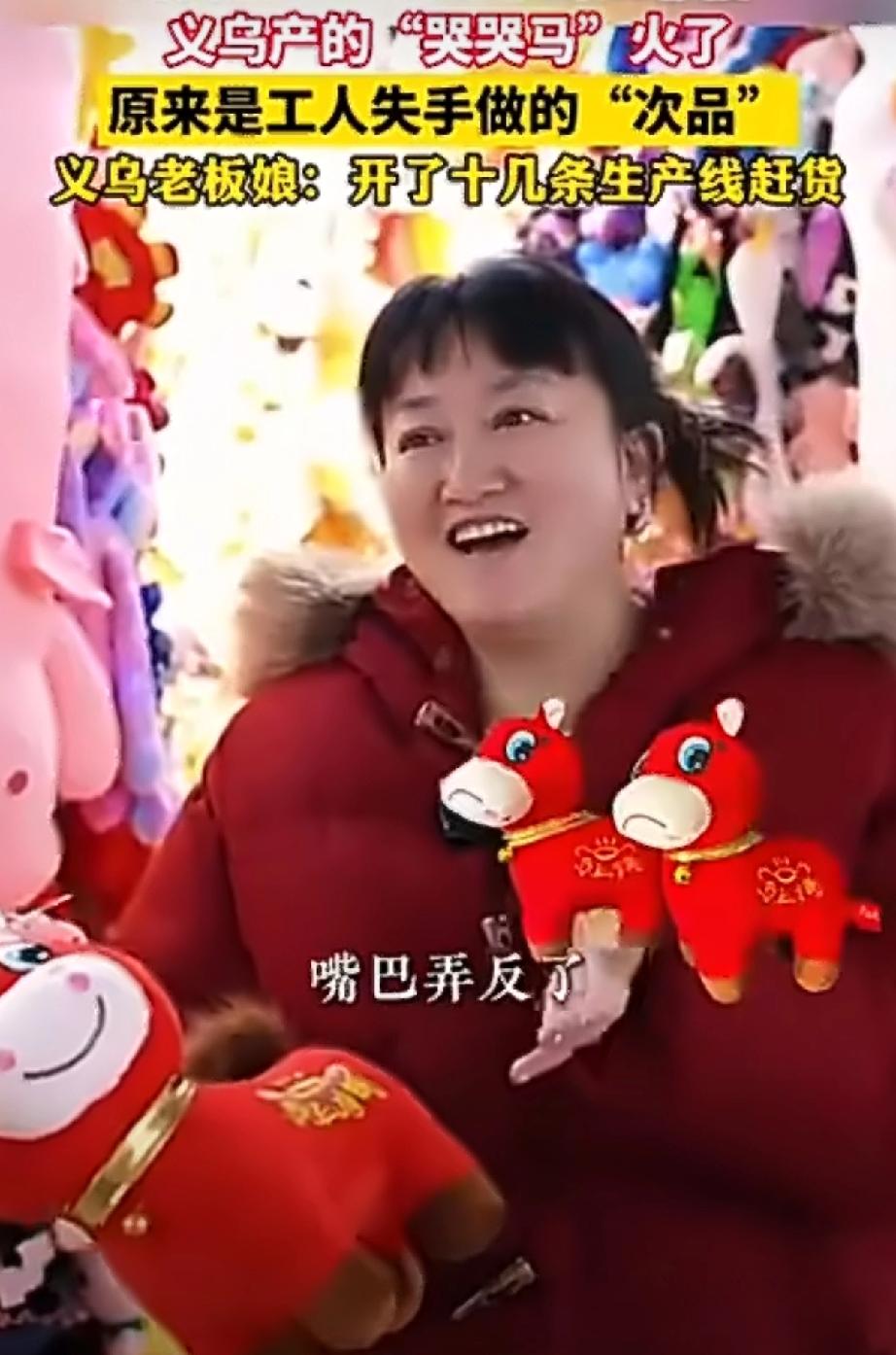 义乌哭哭马火了,次品变爆款,现实版塞翁失马! 最近,一位网友网购了马年公仔,拆开一看,嘴巴缝反了,本该咧嘴笑的小马,变成了一脸委屈的哭脸。 谁想到这条视频一上网,立马戳中了当代人的心声。丧萌丧萌的表情,既可爱又解压,网友们疯狂转发,直呼“这不就是我上班的样子吗?” 订单像雪花一样飞来。义乌国际商贸城的经营户张女士懵了,原本这批货就是工人疏忽搞砸的次品,准备销毁的。现在倒好,全网都在求购这只“哭哭马”。 她赶紧调整生产线,十好几条缝纫机同时开工,踩着踏板日夜赶工,还是供不应求。 她笑着回应:“就是工人疏忽了,嘴巴弄反了。” 还说绝不会涨价,让大家都能拥有这份快乐。 更绝的是网友玩梗的脑洞。“打工不开心?哭哭马陪你”,“新的一年允许自己不开心”。 这哪是买玩偶,分明是给自己找个情绪替身。一个本该报废的瑕疵品,愣是被这届年轻人捧成了顶流。 说白了,这世上哪有绝对的对错。工人手一抖,原本是失误;网友眼一亮,意外成了商机。 义乌这地方,连失误都能变现,靠的不仅是速度,更是那份“来了就接”的灵活劲儿。 最打动人的,是老板娘没趁机涨价,是打工人在玩偶里看见了自己。生活不就这样吗?允许失误,允许不完美,允许不开心。 有时候,最对的恰恰就是那个“错的”。