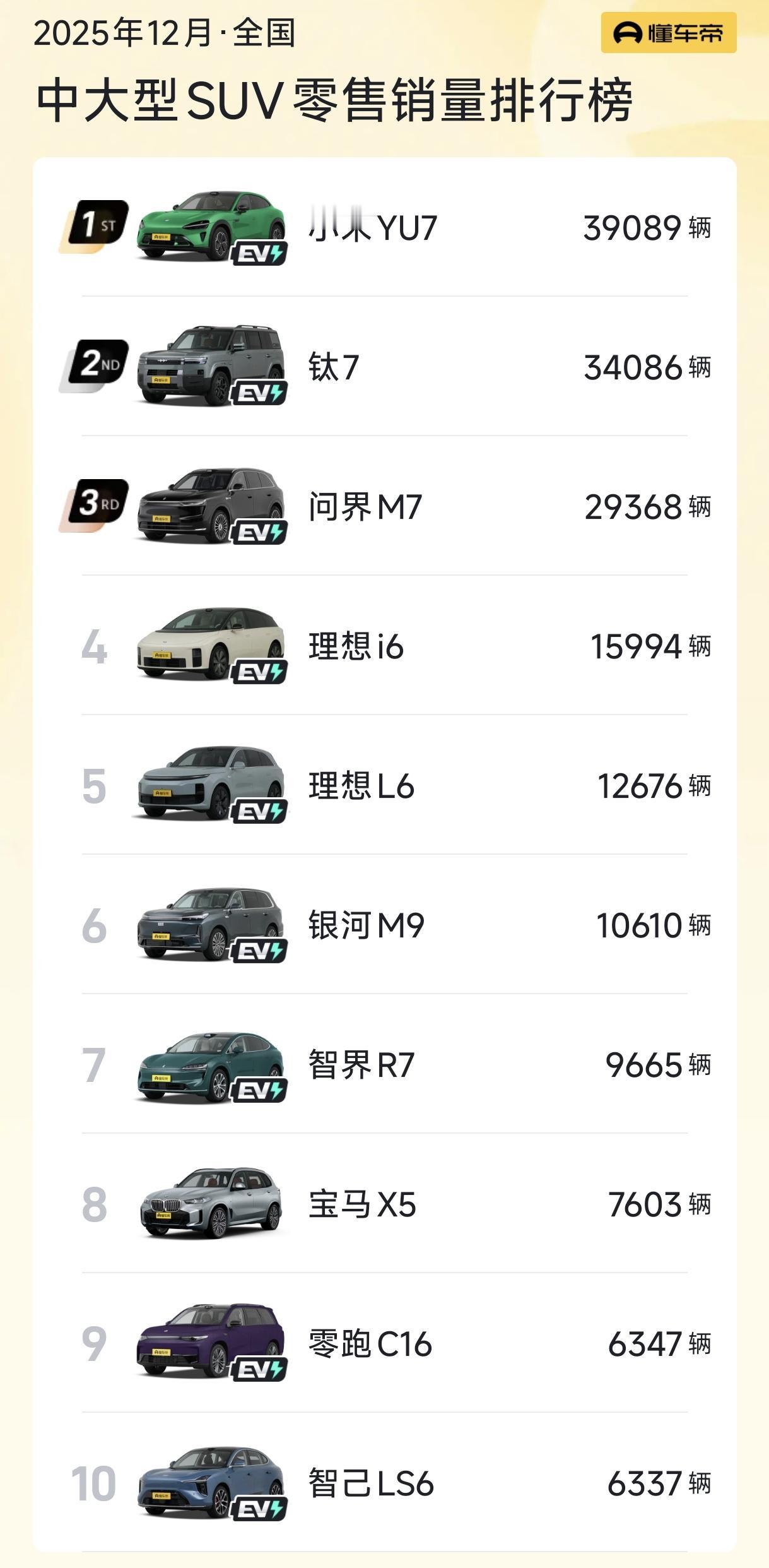 方程豹钛7逆天,小米YU7更逆天,中大型SUV的两个超级霸主,销量惊掉下巴。 12月份,方程豹钛7,卖了惊人的34086辆,这个方头方脑的硬派方盒子,凭借超高性价比,上市就一鸣惊人,销量势如破竹,4个月卖了近10万辆,战斗力极其强悍。 小米YU7更恐怖,12月份卖了逆天的39089辆,连续3个月销量破3万,创造了国产汽车品牌的销量奇迹,稳居中大型SUV霸主地位。 这是在小米YU7交付力受限、网络口碑承压的情况下,取得的惊人战绩。 原本以为问界M7是这个级别的老大,没想到小米YU7和方程豹钛7这么能打,也只能屈居第三了。 方程豹钛7,17.98万的超高性价比,爆款可以理解。 小米YU7颜值一般、价格也一般、网上口碑也一般,为什么销量这么好? 小米YU7