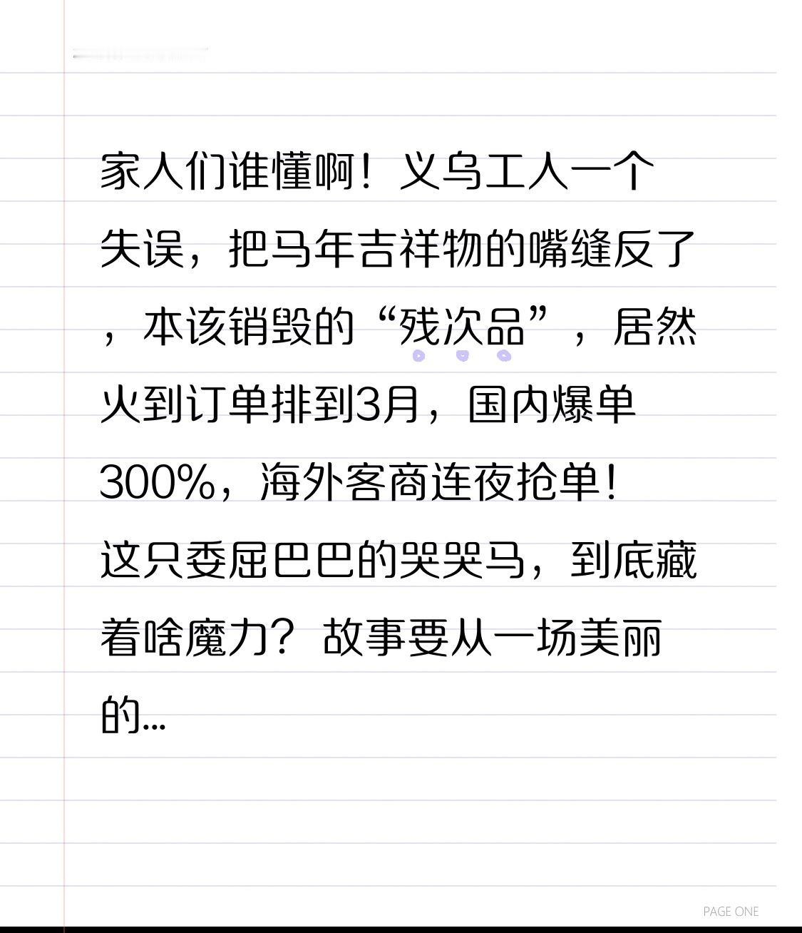 家人们谁懂啊!义乌工人一个失误,把马年吉祥物的嘴缝反了,本该销毁的“残次品”,居然火到订单排到3月,国内爆单300%,海外客商连夜抢单!这只委屈巴巴的哭哭马,到底藏着啥魔力? 故事要从一场美丽的意外说起。义乌玩具厂本来赶制的是嘴角上扬的“笑笑马”,结果工人赶工忙中出错,把嘴角缝成了耷拉款,腮红和鼻孔都歪了,喜庆吉祥物秒变“受气包”。厂长一看全是不合格品,当场决定销毁,多亏厂里00后设计师拦了下来:“现在年轻人就吃丧萌这套,不完美才真实!” 谁也没想到,这批“错版小马”上架后,直接引爆全网!杭州网友拆箱后拍了条视频:“买到了被生活锤过的小马”,24小时内话题阅读破亿,评论区全是求链接的:“这表情不就是周一上班的我?”“加班改方案看到它,瞬间觉得有人懂我!” 原本的吐槽帖,硬生生变成大型求购现场,3天样品就卖了5000单。 哭哭马能火,核心是戳中了当代人的情绪痛点!耷拉的嘴角、无辜的眼神,完美复刻了打工人“表面笑嘻嘻,心里哭唧唧”的日常,被网友戏称“周一马”“加班马”“甲方马”。更绝的是它的解压设计:超软短绒摸起来像云朵,20公分大小能揣进包里,轻轻一捏还会发出“呜呜”的软糯哭声,压力大时捏一捏,仿佛有人陪你一起难过,治愈感直接拉满。 而这背后,离不开义乌的硬核实力!3天加开12条生产线,工人三班倒赶工,缝纫机都快踩出火星子;一周内就推出钥匙扣、U形枕等衍生款,供应链响应速度绝了。最圈粉的是,就算订单排到两个月后,商家始终坚守25元低价,承诺“加产不涨价”,网友直呼“不割韭菜的商家活该爆火”。 如今这只小马还火出了国,成了马年文化输出小使者。其实大家疯抢的不只是一只玩偶,更是一份被理解的温暖。生活哪有那么多完美?就像这只缝反嘴的哭哭马,不完美的真实,才最动人。 允许自己偶尔emo,带着委屈继续前行,这就是成年人的生存哲学。你被这只委屈小马戳中了吗?评论区说说你想把它送给谁~ 记得点赞收藏,转发给你的“打工搭子”!