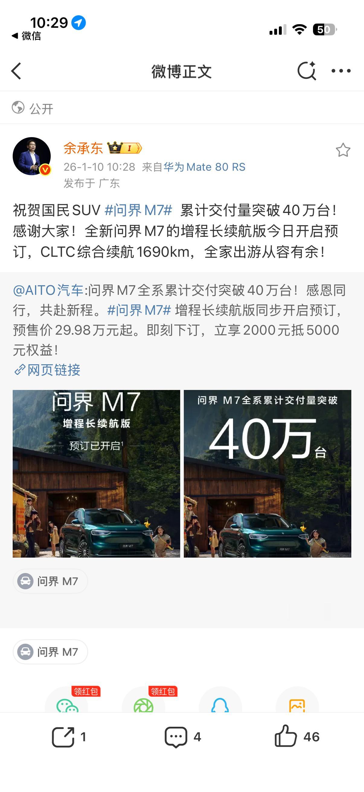 价值领跑30万级SUV市场,全新问界M7脱颖而出的关键是什么? 30万级SUV市场竞争白热化,想要脱颖而出,必须同时具备产品力、口碑和市场认可度。全新问界M7做到了三者兼顾,成为行业新范本。104天交付7万辆、累计交付40万辆的成绩,印证了其市场号召力;连续三期品牌发展信心指数第一、30万元以上品牌百人青睐指数第一,彰显了用户对品牌的高度信赖。这一切都源于华为全栈技术的深度赋能,让它在智能、驾控、安全等核心维度全面领先。在消费升级、追求品质出行的大趋势下,全新问界M7用“技术+口碑+销量”的三重优势,重新定义了30万级SUV的价值标准,也为行业树立了“以用户为中心”的发展标杆。同时,全新问界M7增程Max长续航版开启小订,进一步满足用户的多元化出行需求。