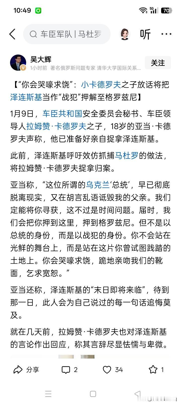 黄毛小儿口出狂言? 一个18岁、但已经是车臣共和国安全委员会秘书(这个秘书,可能比服务的主官还厉害)的车臣小皇帝拉姆赞·卡特罗夫之子亚当·卡特罗夫在1月9日声称:他将把乌克兰总统泽连斯基,以战犯身份押到格罗茲尼,让泽连斯基跪地亲吻他的脚面。 卡特罗夫称王的俄罗斯车臣共和国,充其量不过就是几万装备基本上都是轻武器的军队,与乌克兰的百万大军和设置齐全的军事情报、安全机构相比,根本就不值一提,微不足道。 如此口出狂言,不知道天高地厚,是不是就是在找死呢?