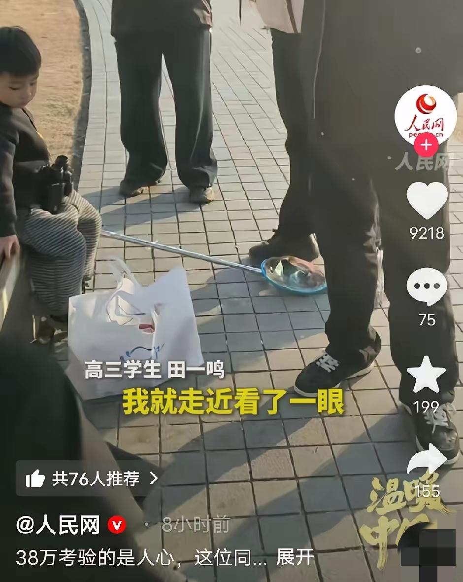 上人民网了!河南郑州,高三学生田一鸣在康平湖公园散步,一个塑料袋引起了他的注意。凑近一看,吓得他赶紧询问旁边打羽毛球的女孩,确认不是她们的东西后,没丝毫犹豫就拨通了报警电话。 周围人都说没监控拿点也查不到,可他愣是寸步不离,直到民警赶来,才知道这38万是别人刚取的订婚彩礼。 面对失主的数千元感谢费,他腼腆拒绝,只说“不是自己的钱,一分都不能拿”,事后还压根没提过这事。 真正的品格从不是装出来的,而是无人监督时的坚守。这38万考验的不只是贪心,更是做人的底线。 你遇到这种情况会怎么做?生活中你见过哪些打动人心的诚信瞬间?