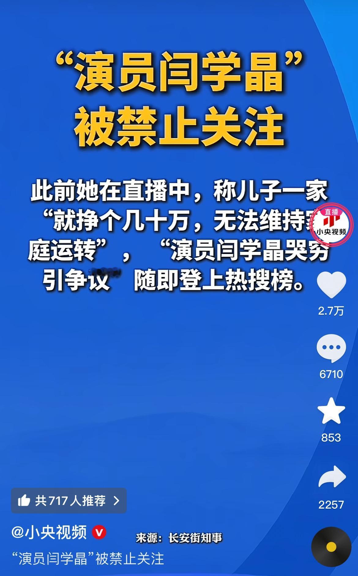 央视点名,闫学晶彻底凉了! 近日,演员闫学晶因在直播中的言论引发广泛争议,刚刚,中央电视台抖音官方账号“小央视频”发布消息,闫学晶账号被抖音平台禁止关注。 事件的起因是她在直播时称儿子一家“就挣个几十万,无法维持家庭运转”,这番“哭穷”言论迅速引发网友热议,相关话题“演员闫学晶哭穷引争议”随即登上热搜榜。 闫学晶作为公众熟知的演员,其公开表达的经济状况描述与大众对其职业收入的普遍认知存在较大反差,从而引发网友对其言论真实性和动机的质疑。 在网络舆论的发酵下,最终其账号被平台采取禁止关注的措施。这一事件也引发了公众对于公众人物言论边界、明星收入认知以及网络舆论监督等方面的讨论。 难以理解,现在信息如此发达的情况下,居然还会有“何不食肉糜”这种无知的事情发生,大家觉得她是真不知道大家的收入水平还是故意炫富呢?