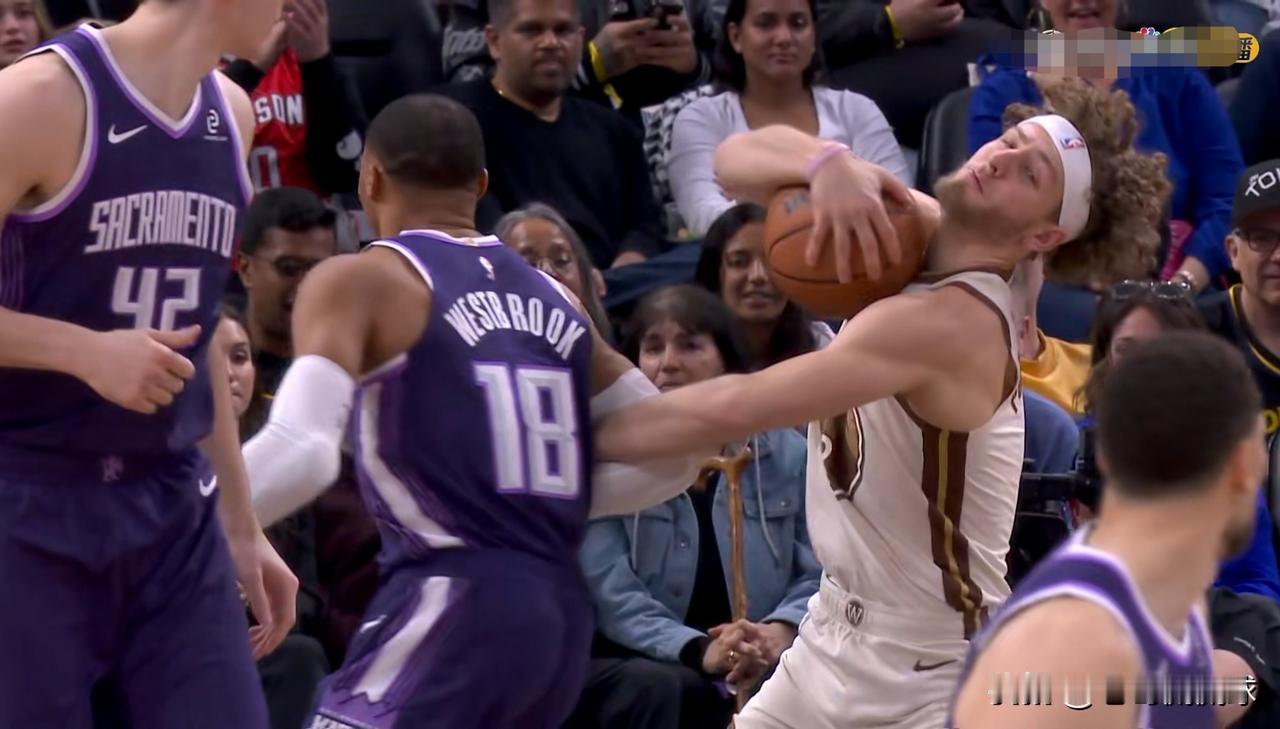 国王老将威斯布鲁克真是太坏了!在今天国王客场挑战勇士的比赛中,当时比赛进行到了第四节的八分多钟,威少在持球强突波杰姆斯基时被后者成功防下,可是威少认为波杰姆斯基防守犯规了,因此恼羞成怒的威少立刻对波杰姆斯基进行犯规,只见威少夹着波杰姆斯基的手臂凶狠的将后者放倒在地,险些导致后者的受伤。对于威少的凶狠犯规,裁判在观看了录像回放以后将威少的犯规升级为了一级恶意犯规。 坦白说,威少的这次犯规确实非常凶狠,他这完全是一次恼羞成怒后的报复性犯规。
