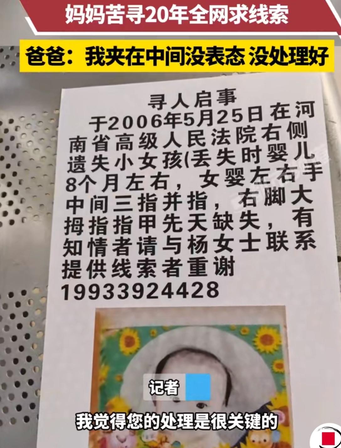 谁能想到! 就为了要个孙子,河南一位婆婆竟狠心把8个月大、有点小残疾的亲孙女偷偷遗弃? 更寒心的是,孩子的亲爸也被重男轻女的思想洗脑,跟着一起做了这荒唐事! 这是真实发生的事,河南杨女士怎么也想不到,自己8个月大的女儿为什么突然消失,直到她以死相逼,婆婆才说出那句扎心的真相:为了要孙子,把有小残疾的孙女遗弃了。 杨女士得知真相后,整整20年都在苦苦找女儿,却连一点线索都没有。哪个当妈的能受得了这种痛? 她心里满是对孩子的亏欠,这些年默默为女儿攒钱,不求原谅,就只想知道孩子现在过得好不好,有没有被好好对待。 20年的日夜牵挂,熬白了头发,揉碎了心,这是一位母亲最深的执念。希望有知情者能伸把手,让这位苦命的妈妈,早日了却寻女的心愿!