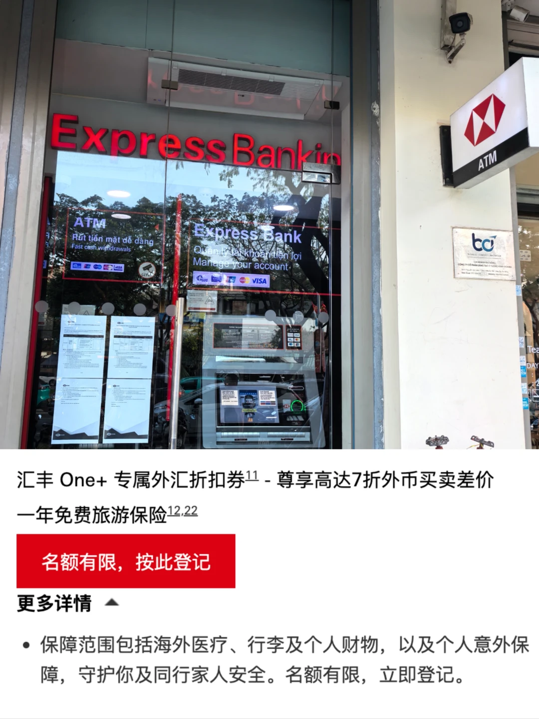 ⭐我是用的汇丰,胡志明和岘港都有汇丰,全球汇丰ATM免手续费取现!如果是香港汇丰One+会员,还有境外旅行福利,支持多种外币兑换,有高达7折的外汇兑换折扣券,很划算;还送一年免费旅游保险,境外旅游保险非常重要,包含海外医疗、行李及个人财物,还有个人意外保等。