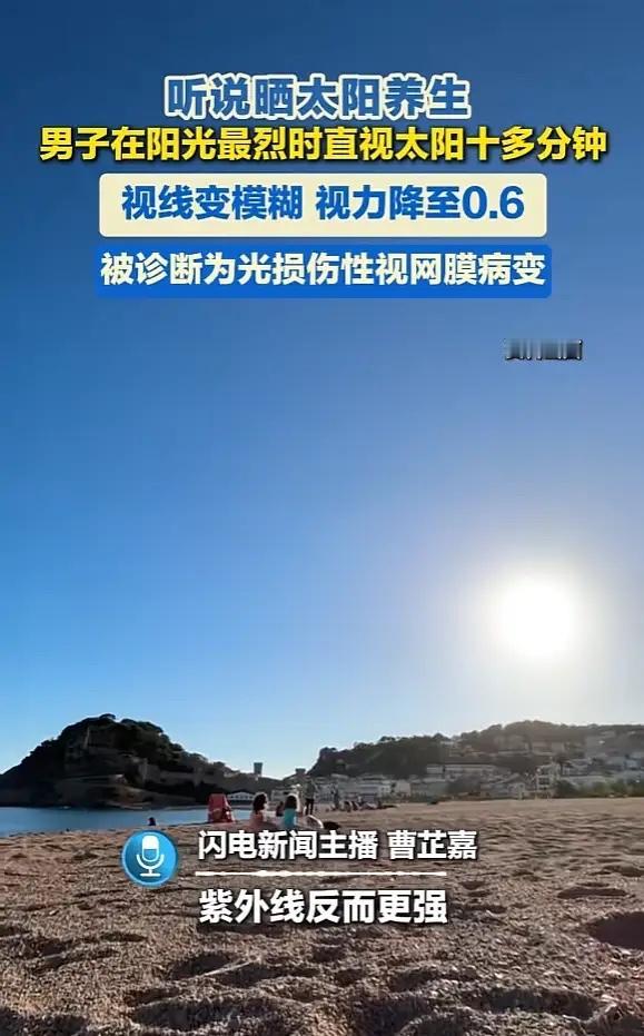 悲剧还是发生了!福建福州,一男子听说晒太阳养生,便在中午阳光最烈的时候直视太阳十多分钟,结果没多久就感觉视线变模糊,看东西像蒙了马赛克,就医后,发现他的视力骤降到0.6,眼睛也出现了不可逆的损伤!医生:光损伤性视网膜病变! 这位男子听闻冬日晒太阳可以养生,便在中午阳光最强烈的时候,特意直视太阳长达十多分钟。他本以为这样是在吸收阳气,却不知自己正一步步走向危险。 没过多久,他就发现眼前的世界变得模糊,看什么东西都像隔着一层马赛克。他赶紧到医院检查,结果矫正视力只剩下0.6,眼睛最核心的感光黄斑区结构出现了断裂。医生诊断这是典型的“光损伤性视网膜病变”,这种损伤很可能是不可逆的。 很多人觉得冬季阳光温和无害,其实冬春季臭氧含量低,紫外线穿透力反而更强,其中的蓝光可以直接到达视网膜,长时间或高强度照射会引发黄斑区细胞的氧化应激,甚至凋亡,造成视物模糊或视野缺损。 随着部分中医养生理念普及,“冬日通阳”的说法流行起来,但很多人理解错了。其本意是在冬季“闭藏”的大原则下,通过适度运动、合理膳食、调节情绪、保证睡眠等方法来温通阳气,确保人体阳气不被寒邪所困,不是鼓励人们直接盯着太阳暴晒。 建议在上午10点前或下午3点后接受短时间的温和日晒就足够了。在户外强光下活动时,应佩戴太阳镜、遮阳帽,绝对要避免直视太阳或其他强光源,即便闭着眼睛,阳光仍可能穿透眼睑造成伤害。 追求健康需要科学的方法,切莫盲目相信甚至误解一些养生说法,用自己的身体做危险的试验。 各位读者你们怎么看?欢迎在评论区讨论。