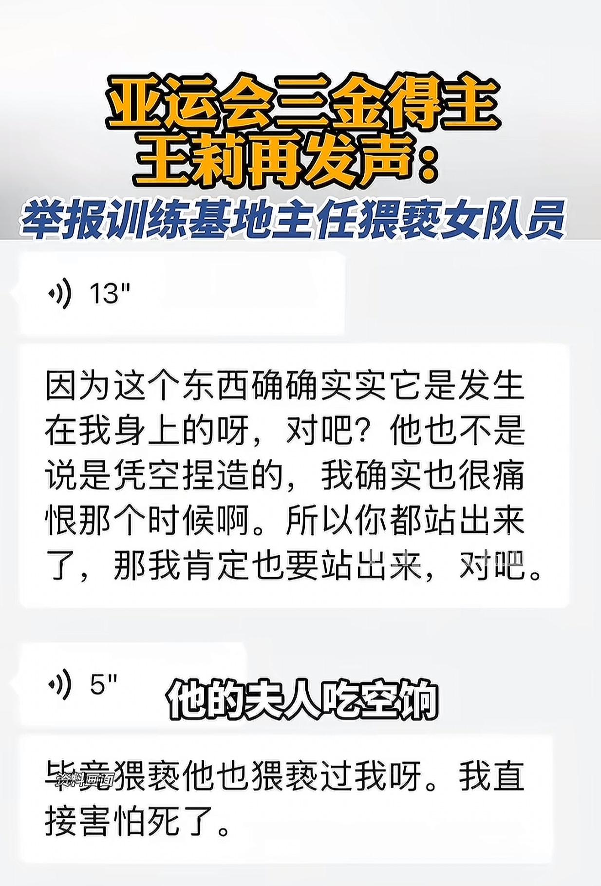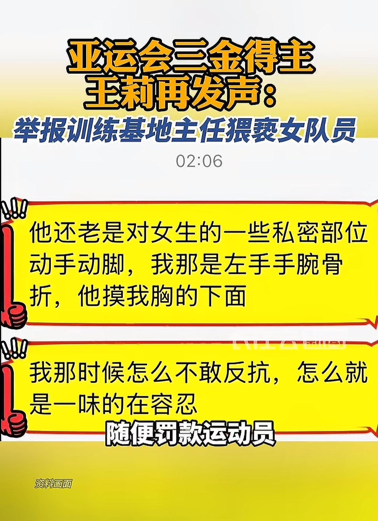 亚运三金王莉再发声,运动员的委屈不该被辜负 时隔25天,王莉终于再次发声,万幸她目前平安,暂居朋友家中。 早在去年12月,她就已向调查组提交全部材料,而这位训练基地主任的所作所为,实在让人愤慨。王莉拼尽全力为国拿下亚运三金,只因拒绝对方索要15万奖金的要求,便遭禁训、被擅自上报退役,断送运动生涯,甚至被逼出重度抑郁。 更让人痛心的是,这位主任不仅克扣队员奖金、让亲属吃空饷,还存在猥亵女队员的行为,队员们因害怕报复,只能默默忍受。 运动员在赛场上为国家拼尽全力,背后却要承受这般不公对待,实在令人心寒。如今涉事人员已停职,只希望调查组能尽快查清真相,还王莉和所有受害队员一个公道,别让为国争光的人,流了汗又寒了心! 全运会王莉