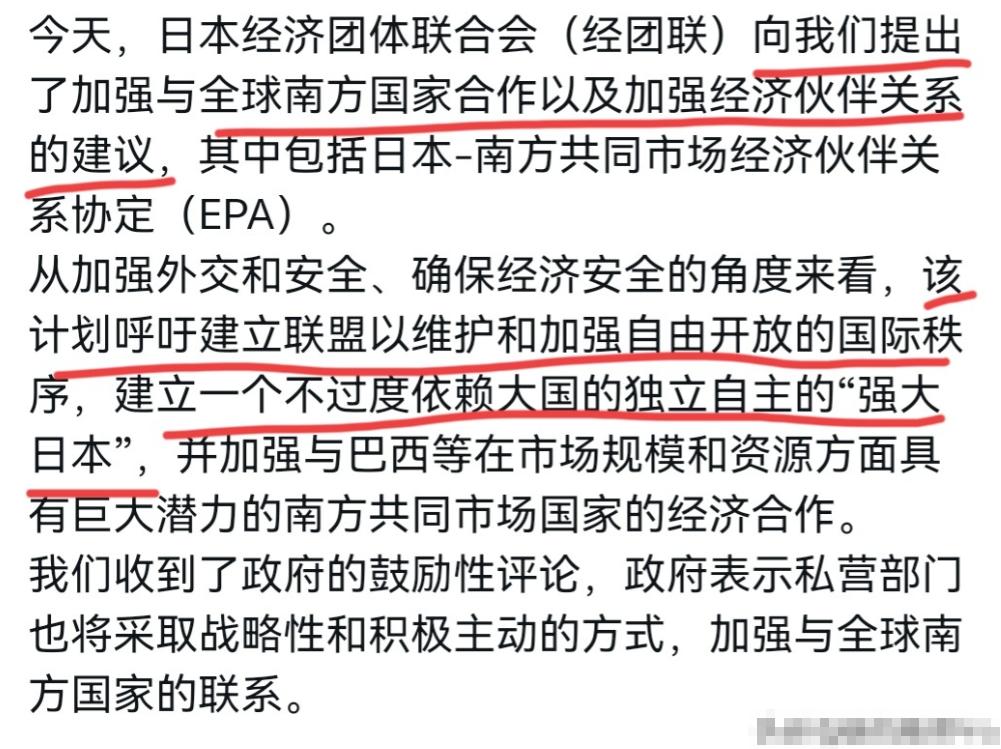 高市早苗出来亮明态度了!在我们反制之后,高市早苗本人进行了一番回应!1月9日,高市早苗发表声明声称,今日,我们收到了日本经济团体联合会的提议,内容聚焦于加强与全球南方国家的合作,以及推进包括日-南方共同市场经济伙伴关系协定在内的经济协作。   该提议指出,需从维护经济安全的角度出发,打造不过度依赖大国、具备自立能力的“强大日本”,尤其要基于市场规模、资源禀赋等优势,加强与巴西等潜力巨大的南方共同市场国家的经济协作。   大家怎么看,一起评论区唠唠!   我们这边刚把对日军用双用途物项的阀门一拧,东京那边立刻开始找台阶,1月9日,高市发表声明,可第一句话不是反思之前的挑衅,而是郑重其事地说,要加强和“全球南方”合作。   看着像在谈贸易,实质上要我说就是在回答一句话:被咱这一刀打疼了,他们打算怎么躲。   先看他们哪儿最先叫疼,商务部的出口管制直指军用相关的双用途物项,这些东西不是少点装饰件那么简单,是日本高科技产业和防务工业的骨头。   日本自己在《通商白皮书》里承认,在几千种主要商品里,有一千多种超过一半的进口额来自中国,是对美依赖的两倍多,日常家电、电子终端、关键化工品、稀土金属,离开中国,价格、交货期都要炸。   这时候再回头看高市口中的“不过度依赖大国、打造具备自立能力的强大日本”,味道就变了。   不是日本突然觉醒要追求战略自主,而是现实扇了一巴掌:长期把供应链捆在中国身上,一旦对方真动手,东京这边立刻心慌。   经团联这个时间点把提案塞上去,高市第一时间拿出来念,本质就是在对国内企业喊话——政府会想办法替你们找备用水井。   日本经济团体联合会的角色不能忽略,它不是普通商会,而是大财团、大企业的总话筒,历届内阁的很多经济政策,背后都有这帮人的影子。   中日关系一紧,工厂订单受影响,供应链被出口管制抽了一闸刀,经团联的焦躁肉眼可见,他们提出“全球南方”“南方共同市场”,说白了就是:既然在中国这边走不顺,那就赶紧去别的地方铺一条路。   为什么盯上全球南方、特别是巴西所在的南共市?算盘很现实。   资源上,这些国家铁矿、粮食、能源储量丰厚,正好补日本天然短板;市场上,人口多、增速快,被视作未来几十年世界经济的增长引擎。   对内可以安慰企业:我们会给你们找新供应地、新市场;对外还能顺便卖一套“自由开放秩序”的话术,想把这些国家拉进自己设想的朋友圈,帮日本在国际上多几票支持。   高市这份声明最微妙的地方在态度上,她全程不提中国,不提管制,不提自己之前那堆涉台妄言,更别说道歉,她好似用一种“我都听到了、但我不认错”的方式,把经团联的建议打包进所谓“国家战略”:以后日本要少依赖大国,要自立,要强大。   换句话说,对中国的反制,她选择的回应不是收回错误,而是调整路线——既然你敢卡我,我就想办法绕开你。   问题在于,这条“去依赖”的路,并没她嘴上说得那么干脆,首先,中日之间的产业链不是临时搭的棚子,中国既是日本的重要供应国,也是重要市场,真要一刀切,成本上升、效率下降是必然,最后很可能变成日本企业自己给自己动外科手术。   其次,全球南方不是谁的备用零件库,巴西、阿根廷、印尼这些国家看重的是公平交易和实际好处,最反感被当成对抗某个大国的工具。   日本如果一边高喊合作、投资,一边在安全议题上跟着G7玩阵营对立,这些国家会很清楚:你是来做生意的,还是来拉人站队的,真把政治条件绑在经贸上,指不定哪天就被对方关门谢客。   再往深里看,日本自己的国力也不允许它无限撒网,高市政府一边推军费翻番,一边靠发国债堆补充预算,财政绷到快断,这个节骨眼上还想大规模砸钱去全球南方铺项目、建产能、搞协定,纸面上画得再好看,落地也得看口袋。   经团联要的是稳供应、保利润,不是跟着政府玩政治豪赌。   所以,这次高市出来“亮明态度”,亮出来的是三个信号:不为之前的挑衅道歉,不承认对华路线有问题,只会承认日本对中国依赖太深;不会因此收敛对华强硬,反而要把“脱钩减依赖”包装成一条通往“强大日本”的必由之路;不会公开摊牌,而是绕个弯,从全球南方那里绕圈子,看起来很硬气,实际上是被现实逼着变着花样找缓冲区。   对我们来说,这说明反制不是白出牌,日本政商两界已经感到切肤之痛,而对日本国内来说,这份声明是高市给经团联、给大企业的安抚:我听到了你们的抱怨,我会用国家战略的名义帮你们分散风险。   高市早苗是出来表态了,但她给出的不是解决问题的钥匙,而是一套自己看着顺眼的心理安慰剂:责任不在我,是依赖太深;错误不在态度,是结构有问题。   现实也许会很快告诉她,喊多少遍“强大日本”不重要,重要的是,当你一边砍掉和中国的稳链,一边还想靠别人帮你兜底,这种两头讨好的算盘,最后大概率还是要自己买单。 对此,大家有什么想说的?