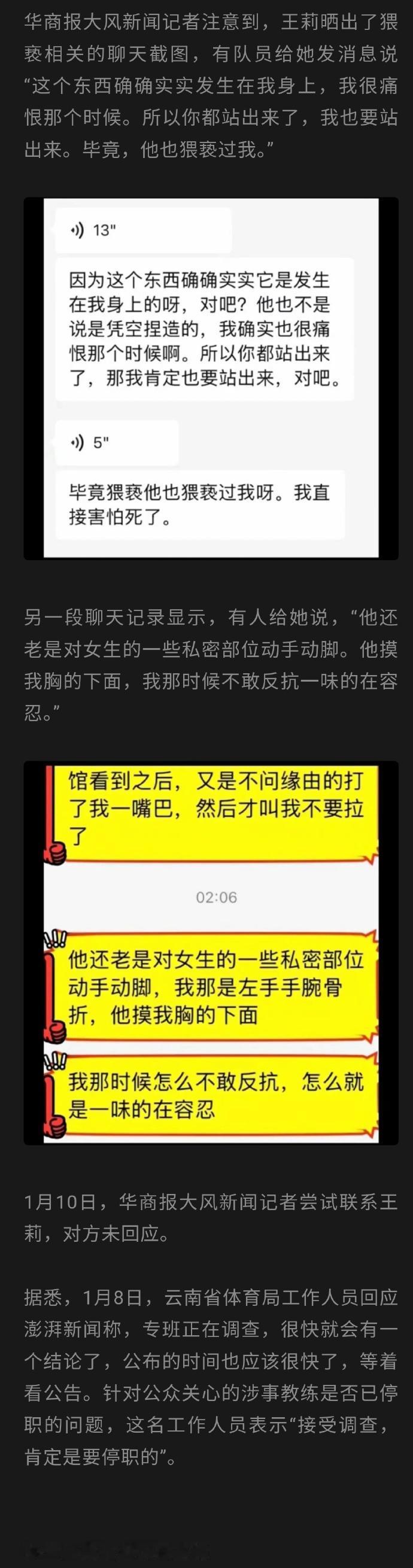 亚运三金得主王莉再发声 举报基地主任猥亵搞迷信 已提交材料 亚运会皮划艇三金得主王莉再曝猛料,实名举报云南松茂体育训练基地主任范某文猥亵女队员、搞封建迷信。她透露15天前已向调查组当面提交全部材料,此前她曾举报对方索要奖金、擅自上报退役材料等行为,自己遭打压患上重度抑郁,涉事主任已停职接受调查。