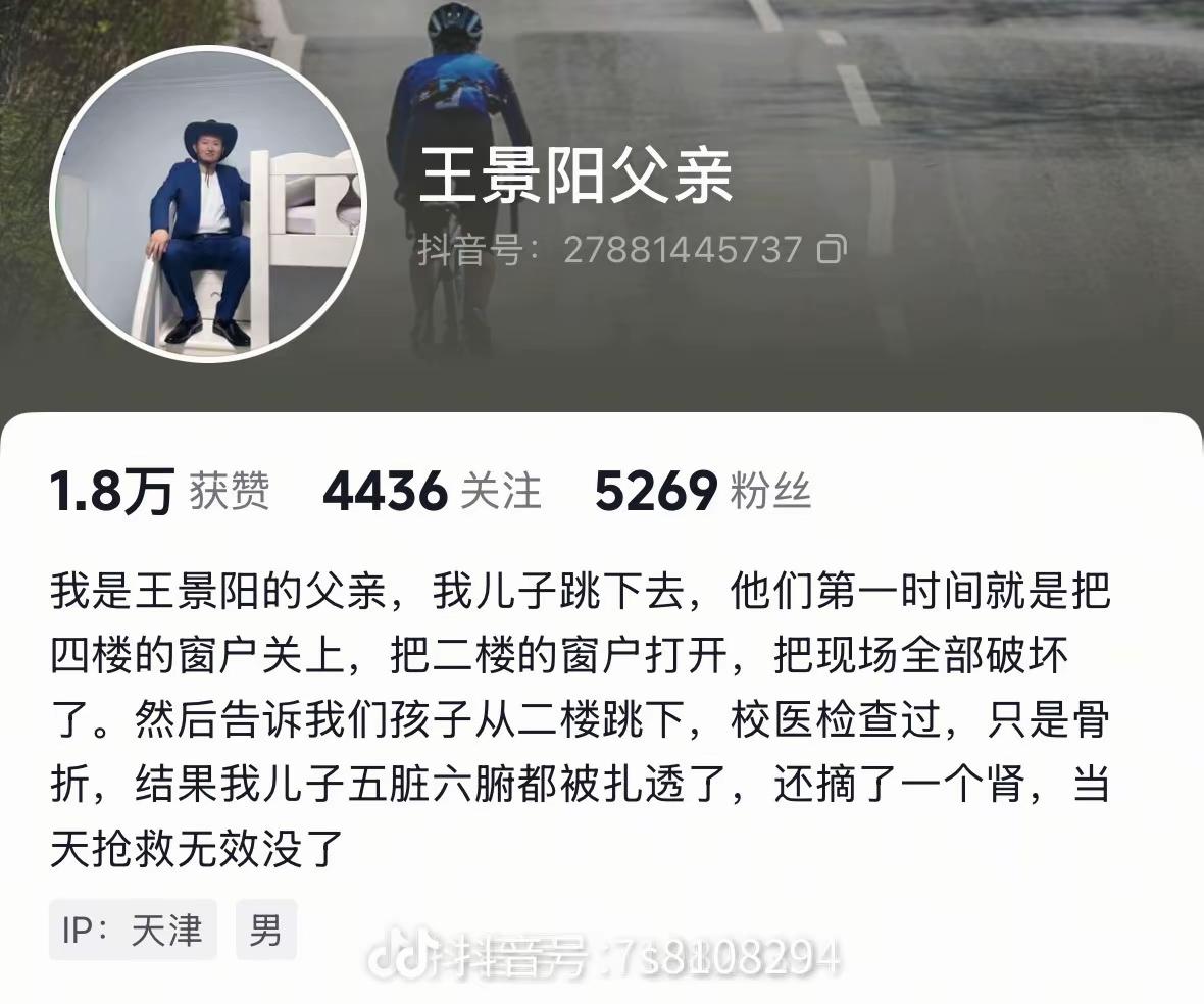 刷到新蔡学生之后,才开始陆续刷到相似的案例,才知道原来有这么多这种事情! 天津王景阳,2025年9月开学了6天半的事件,在学校就没了,学校说是从2楼跳下来的,校医说是骨折,可事实是孩子从4楼跳下去的,五脏六腑都被扎穿了,还摘了一颗肾,而孩子跳楼后第一时间,学校把4楼窗户开了打开了2楼的窗户。 最讽刺的是,看监控楼道监控没有声音,都这个年代了,还有没有声音的监控?太可笑了!而出事时孩子母亲在4楼,却被老师支走带去了操场。 看到孩子父母的维权视频真的挺难受的,不懂为什么现在孩子在学校会突然就没了,可出事了之后监控永远是坏的的,要么就是没有声音的。 看王景阳母亲发的视频配的文案,真的很触动,她在现场,看到了经过,知道发生了什么,而不在现场的父母,或许一辈子也无法知道发生了什么[流泪][流泪][流泪],就比如新蔡的学生,他的父母或许永远也不知道1月8号那天到底发生了什么,让他们永远失去了儿子……