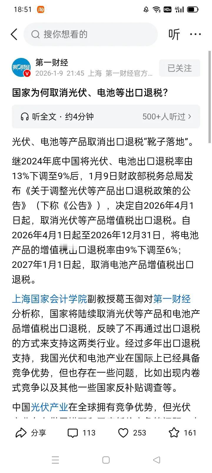 反内卷、减损失! 中国取消光伏及电池出口退税 *25年之前,光伏等产业增值税出口退税率高达13%,24年底下降到9%,今年4月起取消光伏产品出口退税,明年起取消电池出口退税。 *原因如下:1国内光伏产业一拥而上,产能严重过剩,大量产品甚至亏本出口,赔钱赚吆喝!许多企业依赖政府投资、银行贷款及出口退税维持。 造成了国家和社会财富和资源的严重浪费! 2本来外国购买中国物美价廉的光伏电池,是得了大便宜,甚至美国等国还可以额外赚取进口关税。可是它们却反咬一口,对中国企业进行反补贴反倾销制裁!中企几乎是‘赔了夫人又折兵’! 3近两年来,中国光伏产品出口大幅下降,急需治理产能过剩!