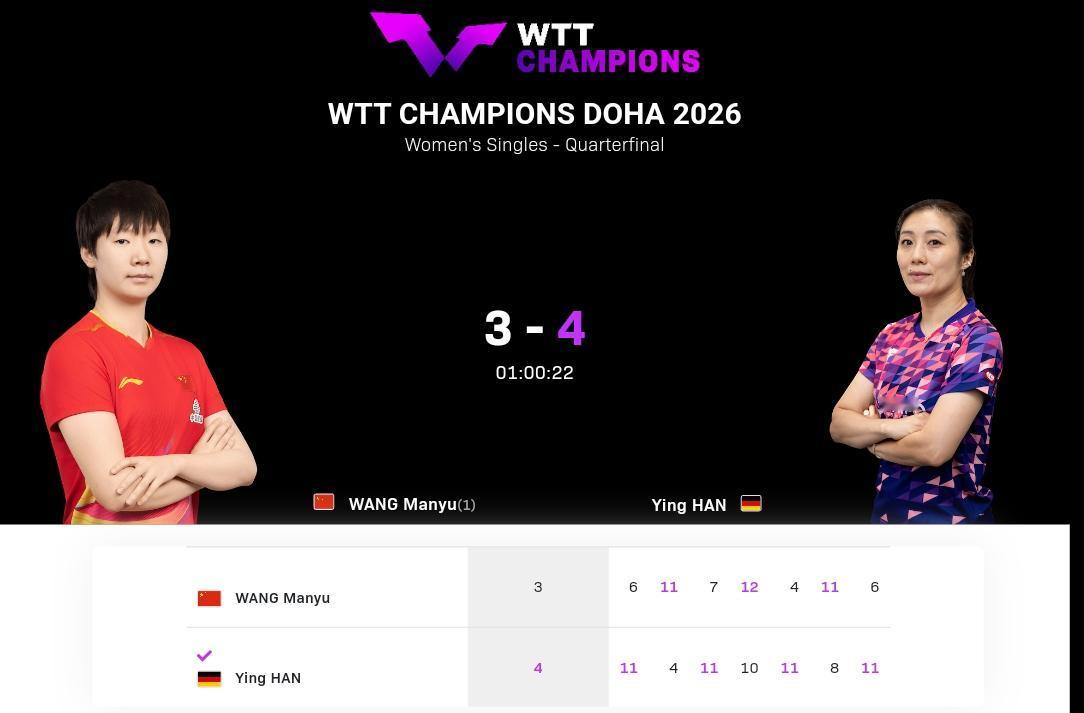多哈冠军赛即时战报,王曼昱在与韩莹的1/4决赛中苦战7盘,以3:4失利。 韩莹太能缠了,两次受伤后还能恢复到这样的竞技水平,实属不易。 在另一场女单1/4决赛中,王艺迪2:4不敌朱雨玲。 这样女单上半区,国乒选手均已出局,只能靠下半区的蒯曼和陈幸同了。
