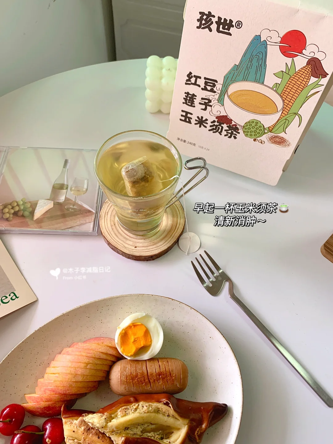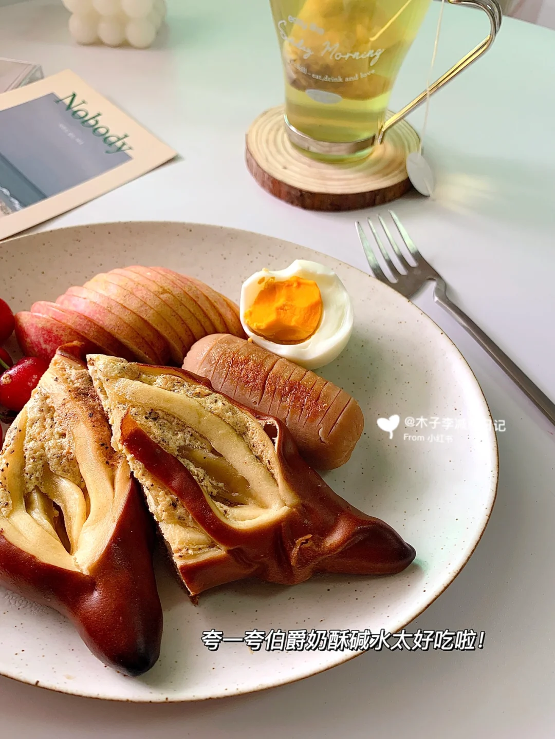 ☀️早餐:樱桃🍒|牛肉肠|伯爵奶酥碱水|鸡蛋|红豆莲子玉米须茶|苹果🍎