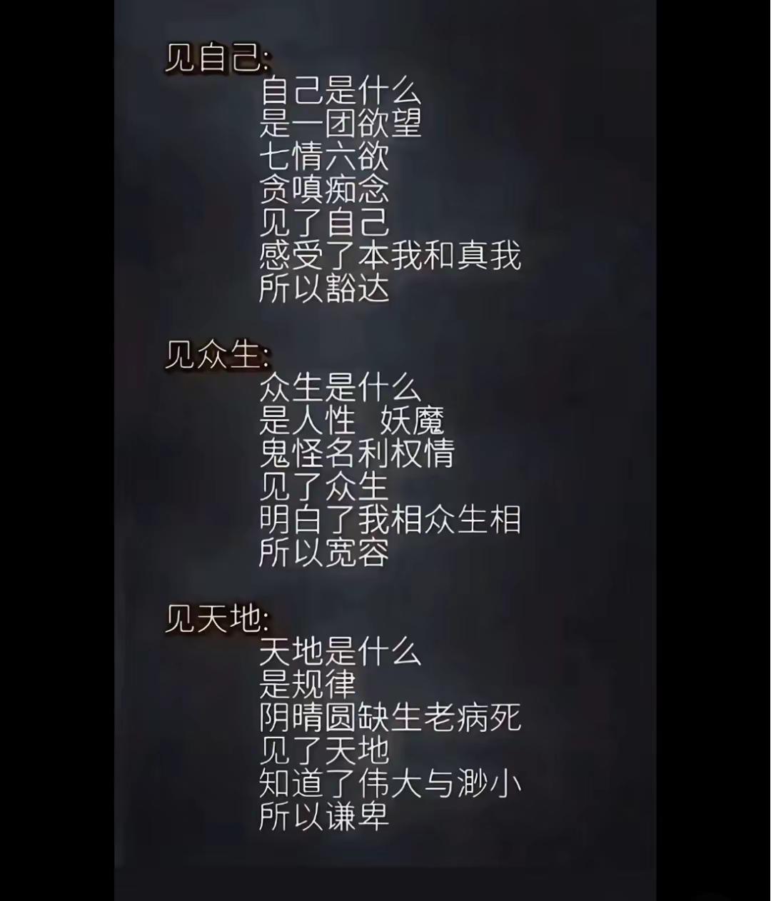 见自己,是心把脑的认知打破,见众生苦,是因为他们活在脑思维下的人,计较永远利与害,所以苦。见天地明规律之理,使心永远贴合或稳合规律,使之行不断较正,追录真理,去恶留善,知行合一,规律是本质与道升华的审美及价值观!