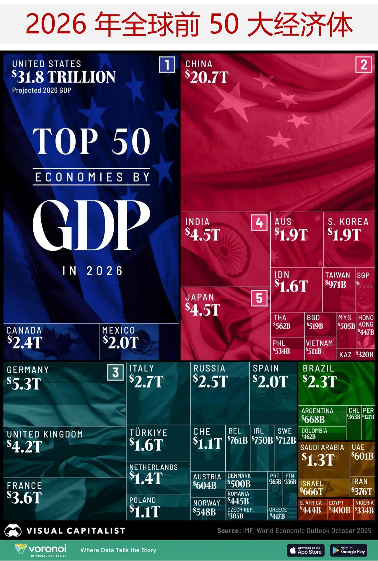 一图读懂2026 年全球前 50 大经济体排名 随着各国从近期的经济冲击中恢复过来,并适应了较高的利率环境,全球经济排名榜也在不断发生变化。 一些经济体凭借快速的增长和产业扩张而不断提升排名,而另一些经济体则依靠规模、服务和自然资源来维持其在全球经济中的影响力。 下面这张信息图表根据国际货币基金组织《世界经济展望》(2025 年 10 月)的数据,对 2026 年预计的全球 50 大经济体的名义国内生产总值(GDP)进行了排名。 2026 年全球最大的经济体 到 2026 年,全球国内生产总值预计将达到 123.6 万亿美元。然而,经济实力仍严重偏向于发达经济体和大型新兴经济体。 美国仍保持着全球最大经济体的地位,预计其 2026 年的国内生产总值将达到 31.8 万亿美元,超过紧随其后的两个国家的总和。尽管近期贸易政策有所变化,但美国的实际国内生产总值预计在 2026 年将增长 2.1%,较 2025 年的 2%略有上升。 中国以 20.7 万亿美元的经济规模位居第二,这表明其经济增长虽较为缓慢,但仍相当可观。中国正朝着先进制造业转型,同时致力于债务可持续性管理,并努力应对人口老龄化问题。 在欧洲,德国依然是最大的经济体,英国、法国和意大利也位列全球十大经济体之列。这些国家在人均国内生产总值方面也属于世界最富裕的经济体之列。 ——新兴经济体跨越 GDP 阶梯向上发展 在 2026 年,许多新兴市场将继续在经济方面占据更重要的地位。印度的经济预计将达到 4.5 万亿美元,使其成为按国内生产总值计算的世界第四大经济体。印度的实际国内生产总值预计将在主要新兴经济体中增长最快,达到 6.2%,这得益于强劲的国内需求和不断扩大的制造业产能。 与此同时,越南、孟加拉国和菲律宾等国家预计也将突破 5000 亿美元的国内生产总值大关,因为它们正日益融入全球供应链之中。2026经济 GDP排名 全球经济实力 全球GDP 全球经济对比