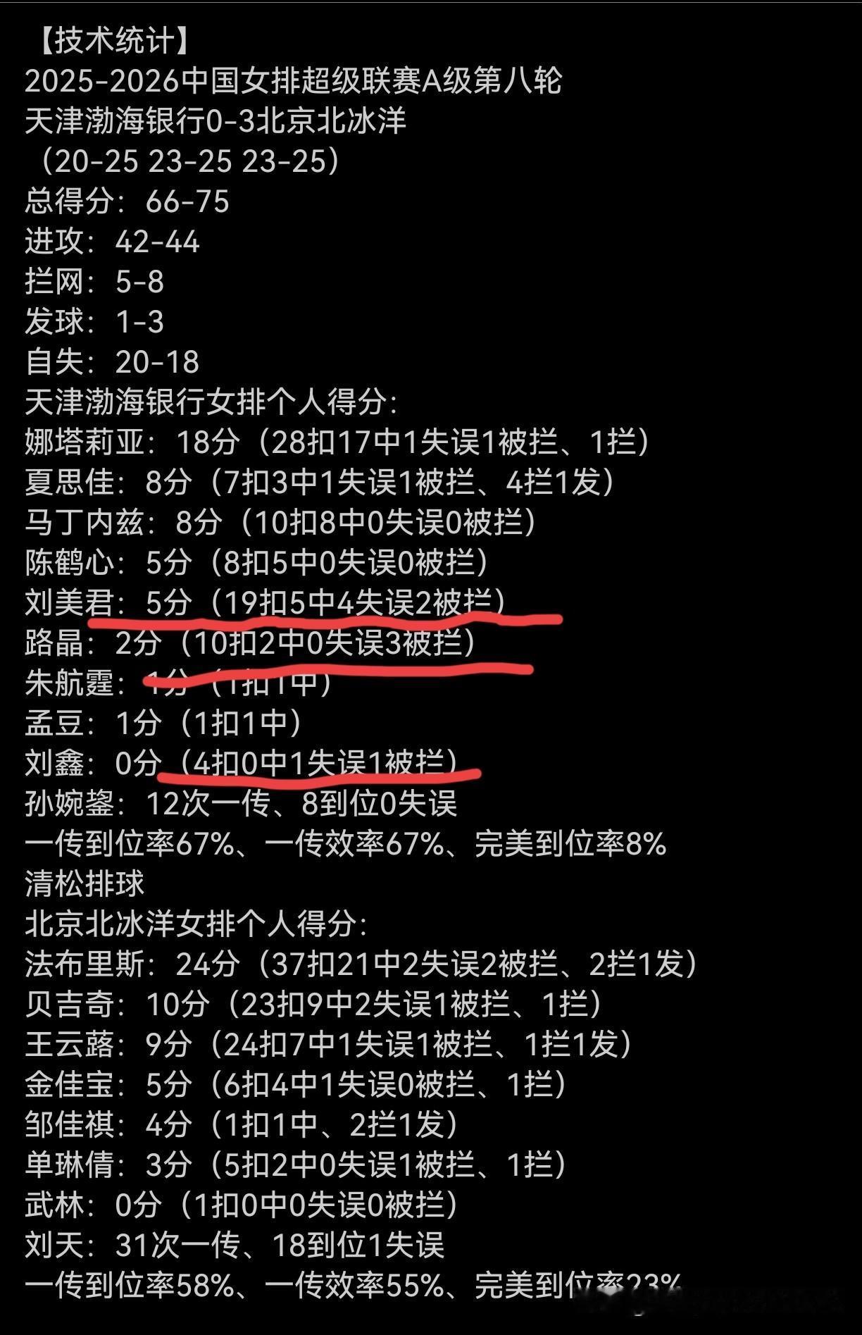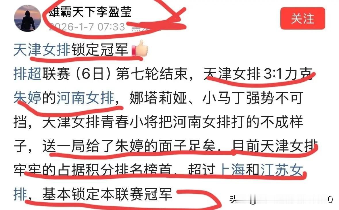 [玫瑰][玫瑰]1月10日,女排联赛迎来了一场备受广大排球迷瞩目的比赛~“平津战”。有三外援的北京北冰洋女排与拥有双外援的天津渤海银行女排展开了有差别级的对决。 结果,北京北冰洋女排在攻防和一传上展现了很强的硬实力,未给对手以任何机会,最终客场以3-0打赢了“平津战役”。 天津渤海银行女排此战失利的主要原因,除实力不济,没有形成主力阵容以及在技战术上和使用人上的患得患失之外,违背规律,滾石硬上山,消耗尽所有导致。 另外,紫人的自大与语海,也是原因之一。对比一下截图二,截图三和截图四、截图五,情况清晰明了,一目了然。 北京北冰洋女排平津战的胜利,顿时给了赛前妄言、 自不量力,自以为是的“ 联赛开打之时, 就是天津女排暴虐各队之时” 的老紫人花头精们当头一棒, 也拉开了再被〝三打”的序幕。[笑哭][笑哭] 天津女排 女排职业联赛