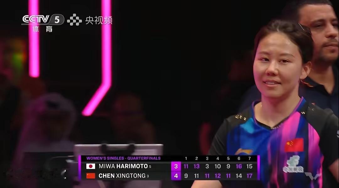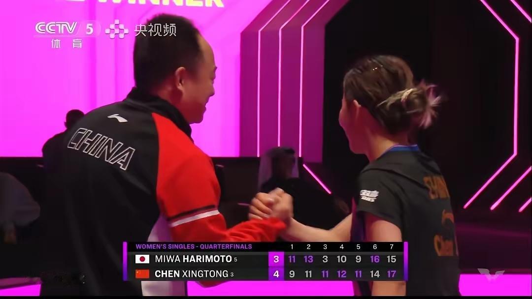 乒乓球之所以迷人, 或许就在于, 不到最后一分钟,不知道谁会赢,一方小小的球台跌宕起伏,充满悬念,比赛的不确定性就是竞技体育最大的魅力。 多哈冠军赛上半区王曼昱3-4爆冷不敌韩莹,王艺迪2-4爆冷输给朱雨玲,下半区陈幸同4-3逆转击败张本美和、蒯曼4-1击败长崎美柚,女队4强占据2席,国乒最大竞争对手日本女乒,全军覆没。 王曼昱出局后,张本美和被视为夺冠热门,但她万万没想到自己在2:0领先的情况下,被陈幸同超级逆转, 七局比分分别为:9-11,11-13,11-3,12-10,11-9,14-16,17-15,整场比赛惊心动魄,七局鏖战耗时长达1小时35分钟,决胜局更是打出罕见高分。 比赛结束后,同同笑得好开心,她真的太棒啦,靠着顽强意志力再次抗日成功,今天她将和蒯曼会师半决赛,帮助国乒锁定一枚女单奖牌!( 图片来源于网络侵删)