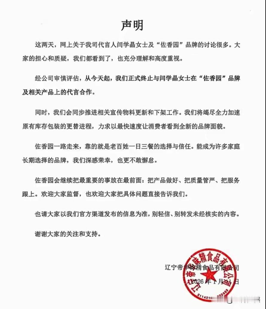 闫学晶女士不想看到的结果还是出现了!2026年1月11日,佐香园发出了声明,正式