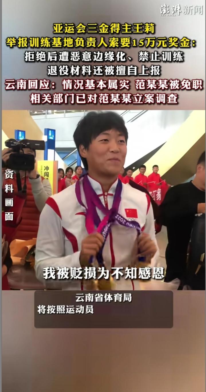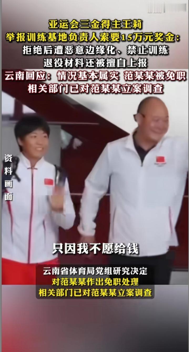 云南松茂体育训练基地近日炸开了锅,亚运三金得主、23岁壮族姑娘王莉的一则实名举报视频,让基地主任范某某成了“体坛反腐网红”。这位为国争光的运动员控诉,自己拼来的15万元国家奖金,竟被范某某直接索要,拒绝后还遭报复——被当众骂“愚孝”、禁止训练,甚至在不知情时被上报退役材料,一句“你们的饭碗是我给的”,活脱脱把公权力当成了“私人提款机”。 更令人咋舌的是,举报还牵出队内乱象:队员因未写日记被罚跪,照片被发家长群;有人头部遭重创缝针,辱骂体罚成常态,范某某还被指安排夫人“吃空饷”、搞封建迷信。网友辣评:“运动员在赛场流汗,他在背后捞钱,这哪是主任,分明是‘土霸王’!”“‘两袖清风献身体育事业’的警言,在他这儿成了‘两袖空空榨取运动员’”。 从法律层面看,范某某的行为早已触碰红线。《中国共产党党员领导干部廉洁从政若干准则》明确禁止索取管理服务对象财物,我国刑法更是将国家工作人员索贿认定为受贿罪,且索贿要从重处罚。如今官方通报“情况基本属实”,范某某被免职立案,正是对“反腐莫论事大小,倡廉不在位高低”的生动践行。 这场反腐风暴让公众看到体育系统的决心,正如网友所言:“净化赛风才能让运动员安心拼搏,不然谁还愿意为国争光?” 期待调查一查到底,不仅要追回运动员的合法权益,更要补上制度漏洞,让“廉洁体育”真正落地,让赛场上的荣耀不再被权力寻租玷污。全运会王莉 运动员人品争议