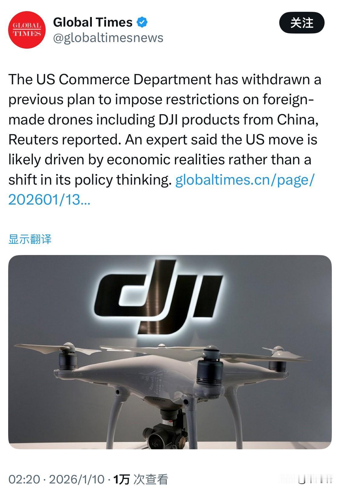 2026年1月9日,美国商务部表示已撤销一项旨在解决所谓“国家安全担忧”而限制中国制造无人机进口的拟议计划。 该限制提案最初于2025年10月8日提交白宫审查,但在2026年1月8日被正式撤回。 这一决定发生在美方与大疆(DJI)代表会面之后。大疆在会面中强调,全面限制中国制造的无人机是不合理的,且会严重损害美国利益相关方(如农业、建筑及应急服务领域)的利益。