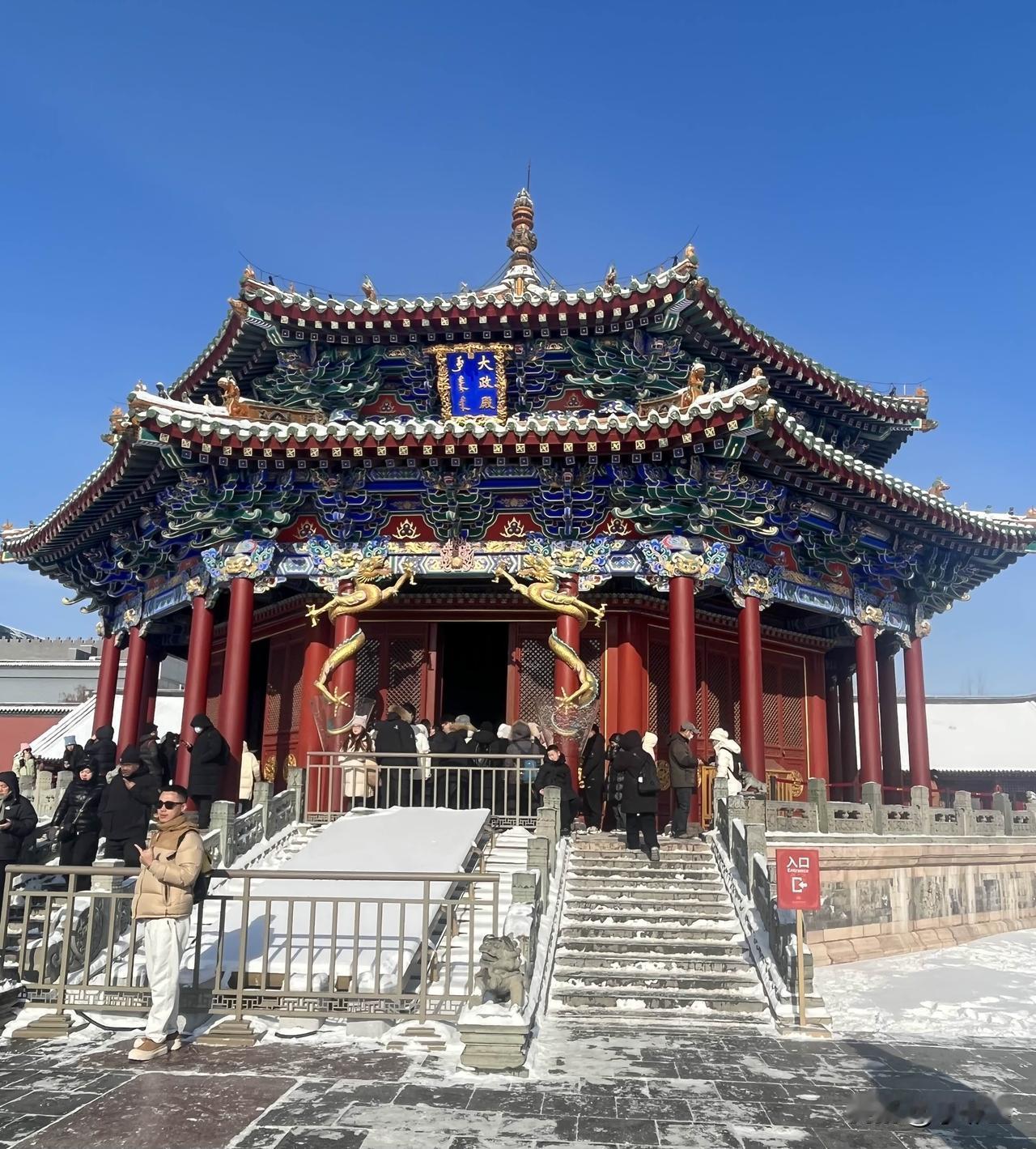 作为沈阳人,又在沈阳故宫附近长大,但也没去过几次,昨天沈阳下了不小的雪,今天早晨心血来潮和老公来领略雪后的沈阳故宫…… 刚下完雪天气很冷,冻得哆嗦的用手机扫码买票,随着人流就进了故宫的大门,人真的很多,有很多南方小土豆,我和老公也仿佛年轻了很多…… 一场雪,让沈阳故宫卸下了历史的厚重,化作了北国冬日动人的诗画。踏雪入园红墙绿瓦被白雪轻覆,阳光穿透时折射出七彩光斑,红与白的碰撞美煞视线…… 大政殿的八角攒尖顶积着蓬松的雪,像一顶洁白皇冠,鎏金宝顶在雪映下璀璨夺目,十王亭沿广场排开,红墙白雪勾勒出整齐轮廓,脚下青砖覆雪,每一步都踩出"咯吱"的脆响…… 真的是落雪如诗,美成盛京……