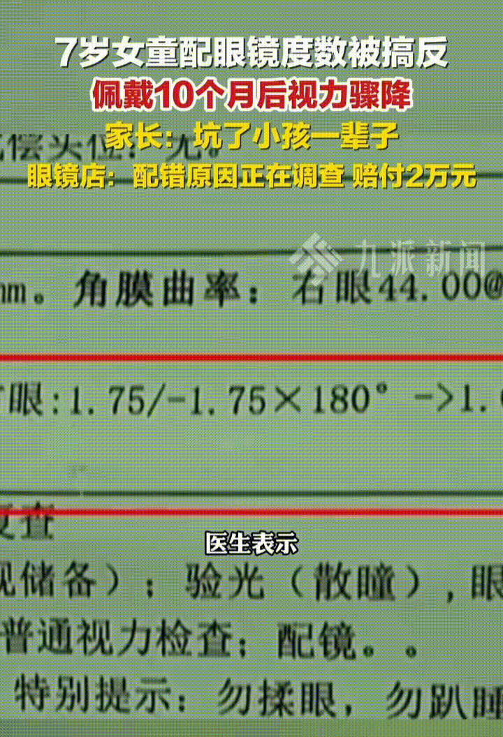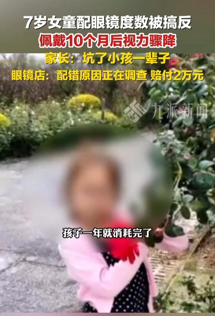 镜片居然还能配反,而且10个月才发现。湖北武汉的7岁小女孩,因为眼睛散光度数增长需要更换眼镜,家长便拿着医院的验光单到眼镜店配镜,没有想到镜片度数被配反了: 孩子戴了10个月,视力严重下降。医院检查才能发现眼镜镜片配反了,远视储备175度加散光200度,被配成了近视175度加近视200度,这一错误导致孩子的眼轴快速加长,原本4年的远视储备不到一年全部消耗完了。 眼镜店表示配错原因在调查,愿意赔付2万元。 真是离谱,作为一个普通眼镜佩戴者,基本都能看懂的验光单,就那么几个参数,一个专业配镜师还看不懂吗。。为什么还能出现这样的错误,然后眼镜配完也不问问孩子佩戴的感觉吗。。