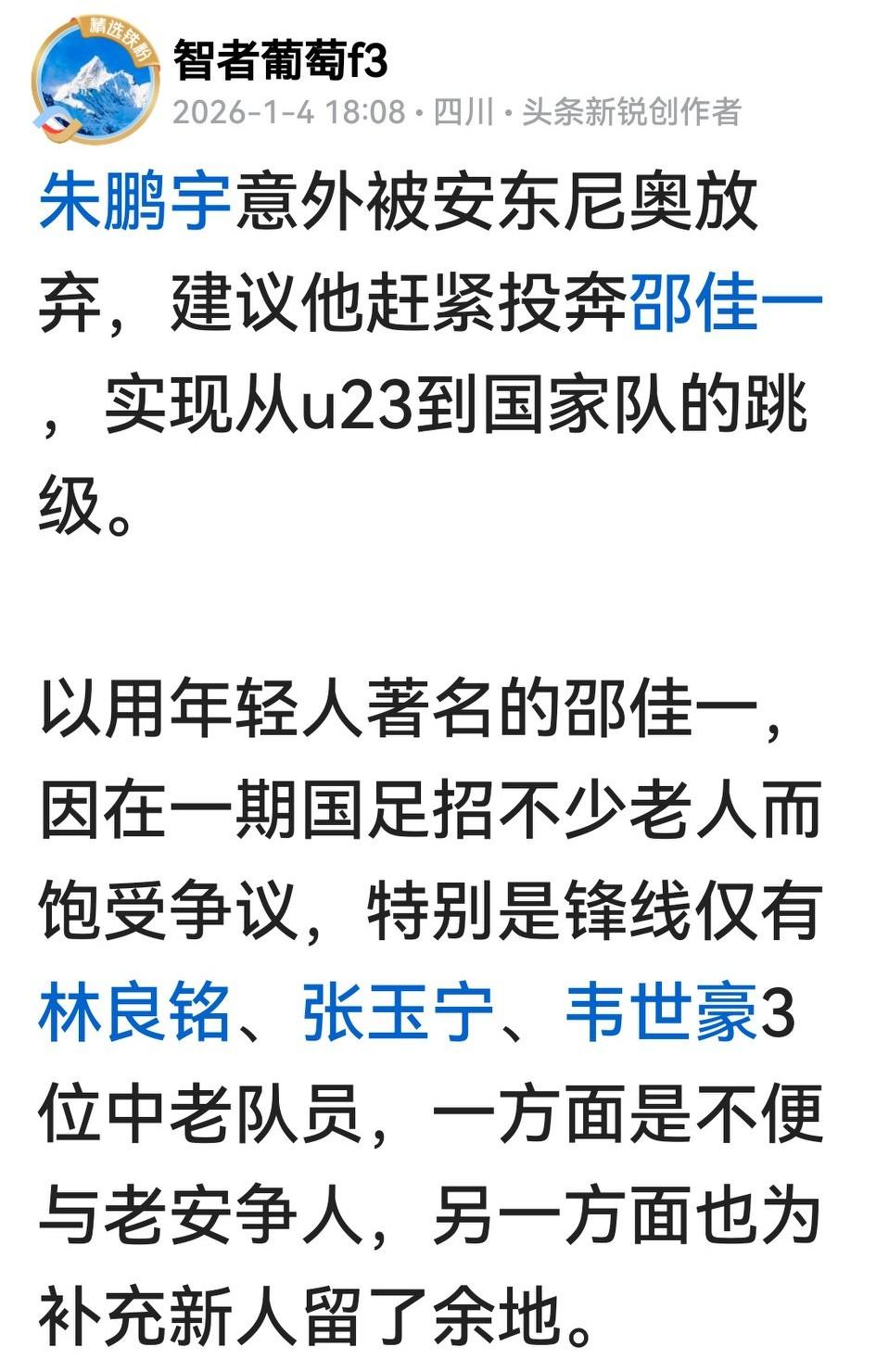此处不留爷,自有留爷处。在U23国足落选的朱鹏宇,果然完成向邵氏国足直接跳级。 回过头看我6天前的发文(附后),真是神预测,自己都觉得牛逼[捂脸]。虽然邵佳一不可能看到我的文章,但他有与我一样的感觉:小将朱鹏宇,绝对有潜力。 小朱机敏又灵巧,技术较出色,速度有优势,在国是锋线也是一种选择。说他身体欠硬朗、对抗性不足,就将其抛弃放弃,但愿u23亚洲杯后,安东尼奥不会因放弃小朱而后悔。