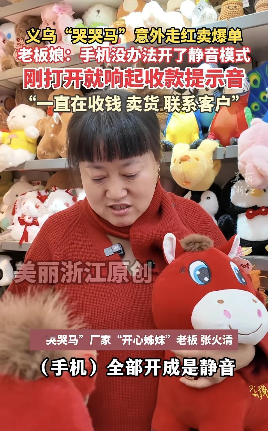 要我说,大家买的不是马,是那个“不完美”的自己,缝错嘴巴的玩偶,也让老板娘手机响到不敢开声音。 最近,义乌国际商贸城的老板娘张火清,被自己家一款“做坏了”的玩具彻底整懵了。 本来,她工厂里生产的是喜气的马年公仔,叫“笑笑马”。 结果一个工人没留神,把其中一只小马的嘴巴给缝反了,笑脸瞬间变成了委屈的“哭哭脸”。这要搁以前,这就是个等着返工或者报废的次品。 巧的是,一位杭州的网友正好买到了这只“错版”小马,觉得有趣就把照片发到了网上。 她本意可能是跟店家吐槽一下,没想到评论区一下子炸了锅。好多人说:“哎嘛,这委屈样儿反而更萌了!” 甚至不少人开始追问店家:“这‘哭哭马’单独卖不?我就想买这个!” 那边的老板娘张火清,前一秒可能还在为出了次品头疼,后一秒就被雪花般飞来的订单给“砸”醒了。 她的反应也堪称义乌速度:立刻让工人别再改那个“错误”的针法,就照着“哭哭”的样子做,同时火速加开了十几条生产线专门生产这个意外爆款。 最生动的细节是,生意好到她的手机收款提示音从早响到晚,吵得不行,据说只能调成静音模式,不然根本没法干活和联系客户。这款高约20厘米的小公仔定价25元,老板娘明确说了,不会因为火了就涨价。 而从生产失误到全网爆款,这匹“哭哭马”只用了几天时间就完成了逆袭。 要我说这“委屈脸”简直成了打工人的“嘴替”。 上班被老板说两句,下班挤地铁累成狗,回家还有一堆事……好多时候心里就是憋着这么一股委屈劲儿,说不出来。 现在好了,看到桌上那个嘴角下撇、一脸生无可恋的“哭哭马”,瞬间就共鸣了:“看,不止我这样,连马都在哭。” 它成了一个小小的心情出口,一种无声的自嘲和安慰。你们认为呢?