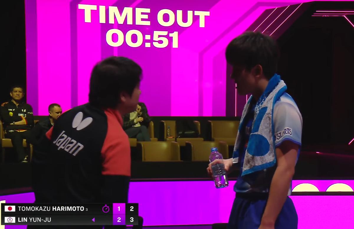 张本智和要输了! 前三局1:2落后, 第四局开局就叫了暂停, 他和教练说, 林昀儒的拧拉, 我没办法接! 看来克制张本智和的办法就是拧拉。 张本智和每次赢球都对着教练吼, 我看网友都在说他不礼貌。 而且他嘴里还叨叨不停, 他教练也有点头,摆手等动作, 这是在互动吗? 显然违规了。