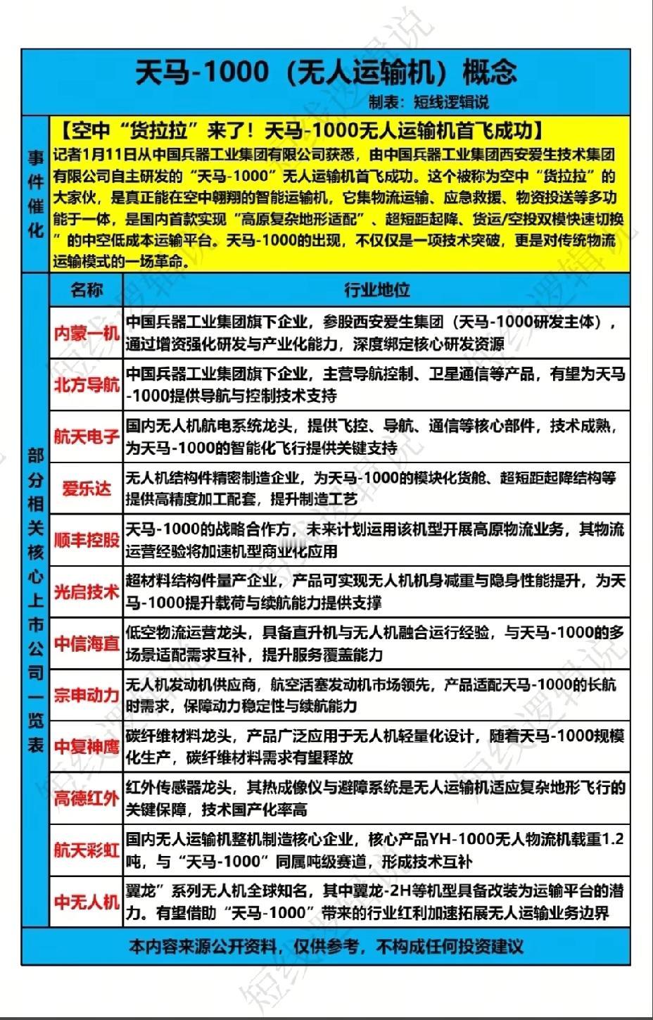 1月11日,下周A股这个板块有望大爆发!!! 空中“货拉拉”来了,天马-1000无人运输机首飞成功,它集物流运输、应急救援、物资投送等多功能于一体,重点关注:航天电子、光启技术、高德红外,相关概念股值得重点关注!!!