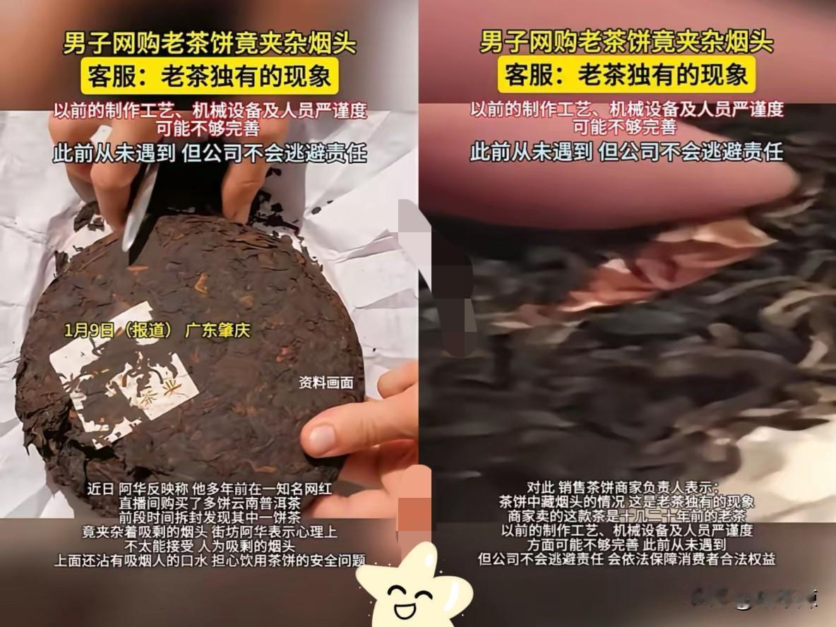 近日,广东肇庆,一男子拆开两年前买的茶饼时,竟发现里面半截带污渍的烟头,客服的回应更让人怒了——居然狡辩这是老茶独有现象,代表货真价实! 入口的东西,卫生底线绝不能破。茶叶里混进烟头,分明是生产或仓储环节的卫生失控,可商家不仅不道歉担责,反倒拿荒唐说辞糊弄消费者,把大家当傻子耍! 食品安全法早就明确,食品掺杂异物消费者可索赔,不足一千元按一千元算。这种敷衍塞责的态度,比烟头本身更让人膈应! 老茶的珍贵在于工艺和年份,绝不是藏污纳垢的借口。把卫生隐患包装成“防伪标识”,这样的商家迟早砸了自己的招牌! 大家怎么看呢?