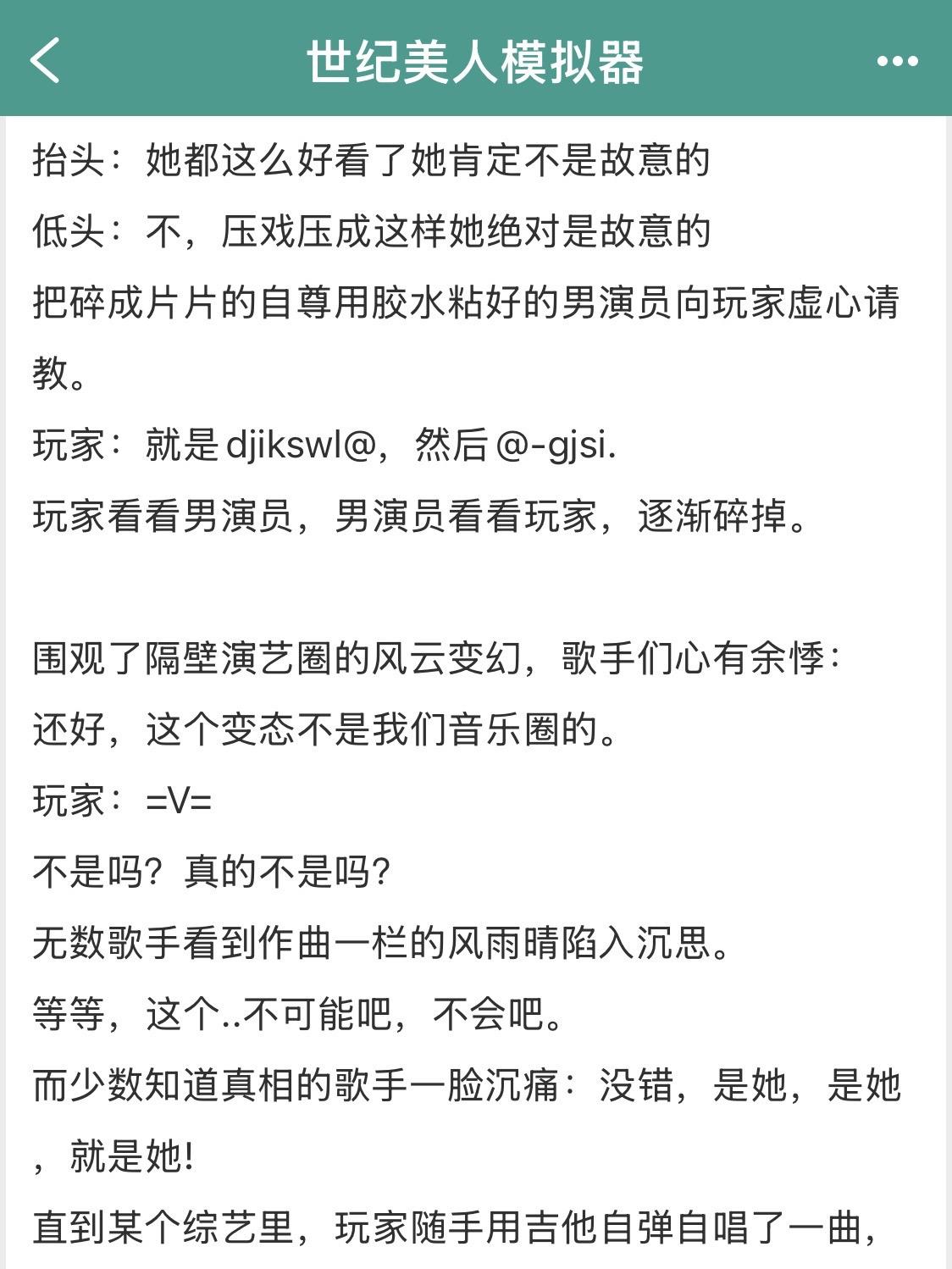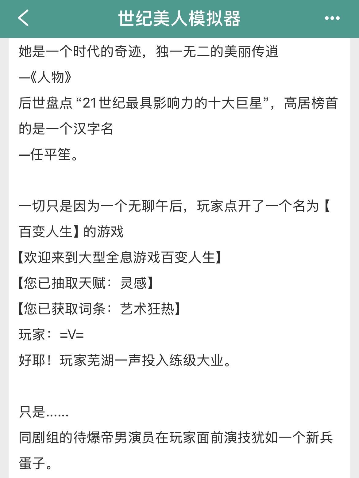 女主无敌娱乐圈模拟器流爽文!女主无敌娱乐圈模拟器流爽文! ※设定好看+剧情爽+万人迷娱乐圈文! ※有感情线,但正文无男主。 ※模拟器+第四天灾+无敌流。 书名:《世纪美人模拟器》 作者:玉色川 标签:娱乐圈文、爽文、第四天灾文、万人迷文、模拟器文、完结文