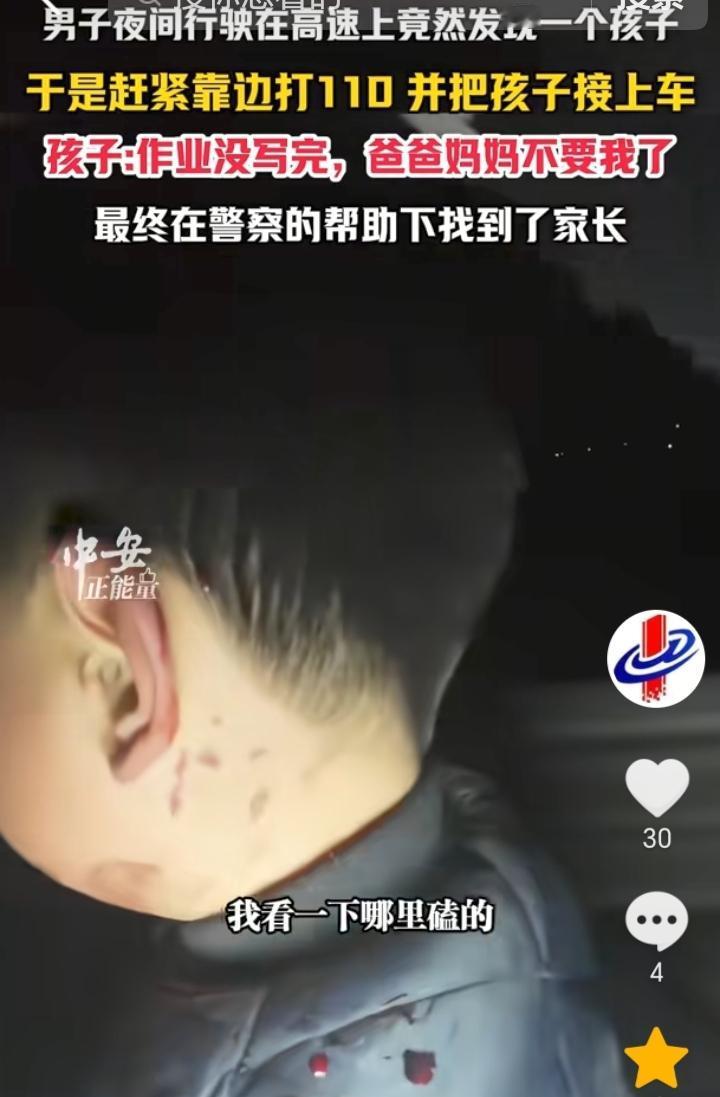 “心真大”!山东,男子夜间开车在高速上行驶,突然发现一个小孩独自在路上走,男子下车询问孩子为什么一个人在路上走?小孩表示,自己作业没有写完被赶出来了,走了快半小时了,爸爸妈妈不要我了,在小孩说原因的时候,男子还发现小孩头上耳朵后面有血迹,询问得知是小孩自己摔跤磕着了,因为天气冷,男子就让小孩上了车,然后报了警,最终在民警的帮助下找到了孩子的家长。 这家长也是心大,大晚上直接把孩赶出家门,孩子头都磕破了,家长也是不担心孩子会不会出事,多亏了男子发现及时报了警。 可能孩子不好好写作业,家长也是想给孩子一个教训,不过家长这种方式方法明显是欠缺考虑的,孩子还小也没有安全意识,大晚上赶孩子出去是很容易出现危险的。 每个家长都有一颗望子成龙,望女成凤的心可以理解,但是做任何事都要用对方式方法,孩子不写作业可以教育,但是不能大晚上把孩子赶出家门,如果出事后悔都来不及了。