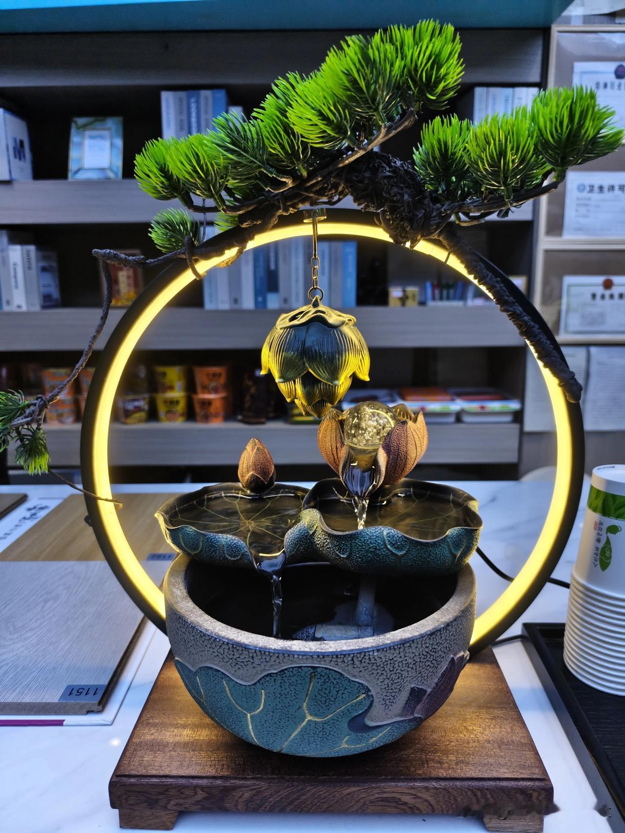 刚入手的流水摆件也太戳我了!🌿 迎客松的苍劲枝桠绕着暖光圆环,莲花垂坠下来,清泉顺着花瓣叮咚淌进石纹缸里,水雾氤氲的时候,感觉整个书房的浮躁都被抚平了。 水流循环的设计还藏着“流水生财”的好寓意,往书桌一摆,既是摆件也是风水好物,连朋友来串门都追着要链接! 你们觉得这摆件摆客厅还是书房更合适?评论区聊聊~