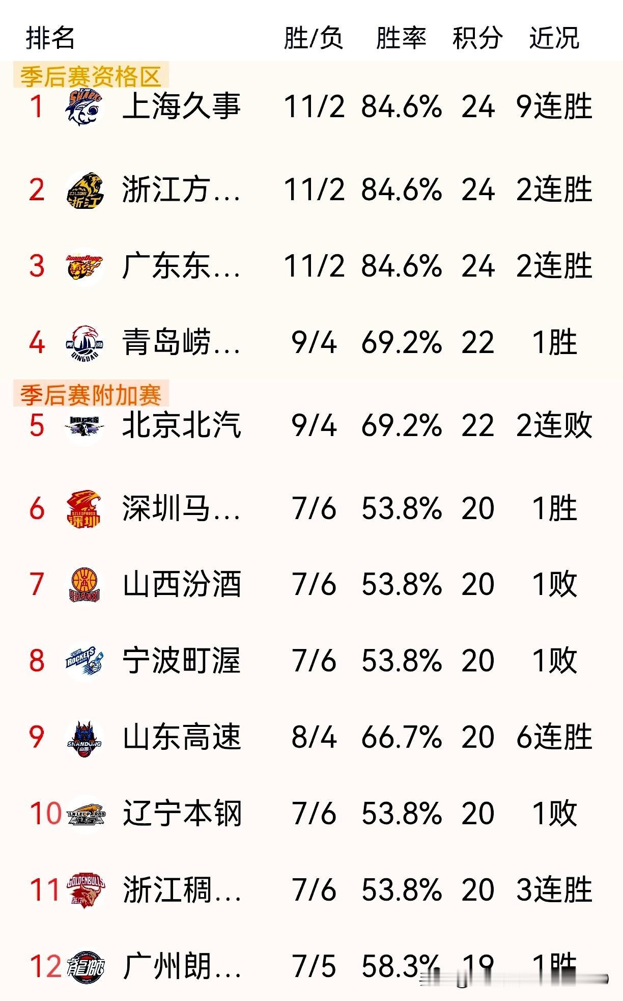 CBA联赛除山东高速和广州朗肽海本少战一场外,其余18队都打完了十三轮。 从基本的胜负积分榜排名来看,上海久事、浙江广厦、广东东阳光,三队11胜2负, 青岛崂山啤酒、北京北汽两队9胜4负,山东高速8胜4负,当位居前六名,是常规赛前四和总决赛的有力竞争者。其中:上海久事、浙江广厦、广东东阳光和北京北汽,最被球迷看好。而落后的三队天津、江苏和四川已基本退出季后赛的竞争。另11队将竞争5个季后赛名额, 这是目前的基本态势,应是大差不差,八九不离十的事。 排名靠后及下游的以与排名第一集团队的差距是显而易见的,是整体全方位的,根本不在一个层级,无论从硬实力、阵容的配置、俱乐部的投入和球员个人的综合能力来看,都无法与之匹配,可以说是先天性的差距。 中上或中游或中下游的十一支队,有差别,但差距不太大,相互之间有竞争力,属季后赛前六以后的球队和季后赛边缘的球队。注定这十一支队中有五支要被淘汰出季后赛。 强队有为数不多的输球,很正常,但这不是常态,不是趋势,而是较小的概率。而处在中下游的队,输球是常态化,是趋势,是大概率事件。 竞技体育以弱胜强有之,但极少,是小概率事件。竞技体育以强胜弱,是常态化,是大概率事件,其战例比比皆是,举不胜举。 因此,竞技体育归根结底讲的还是硬实力,讲的整个赛事周期的硬实力和战绩,讲的是球队的定位与在赛季的进步表现。毕竟冠军只有一个,亚军与前八名也是好成绩。 CBA联赛