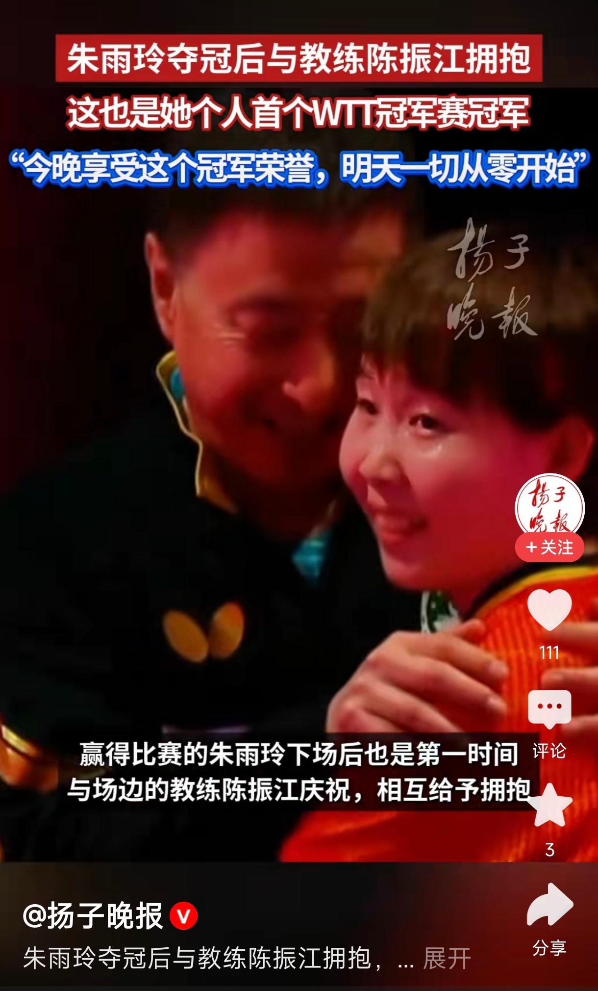 朱雨玲夺冠后与教练拥抱 朱雨玲在夺冠后与教练陈振江热情拥抱,庆祝她个人首个WTT冠军赛冠军。这一胜利不仅代表了她在职业生涯中的重要突破,也彰显了团队的共同努力。她在赛后表示:“今晚享受这个冠军荣誉,明天一切从零开始”,展现了她谦虚和积极的心态。此次胜利无疑是她职业生涯的重要里程碑,也为未来的比赛增添了更多信心和动力。朱雨玲