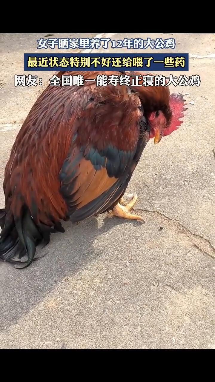 女子晒家里养了12年的大公鸡,最近状态特别不好,还给喂了一些药。网友:全国唯一能寿终正寝的大公鸡。 看看我们家这只养了12年的大公鸡,最近快要嘎了,应该是太老了。这个鸡跟我儿子一样大,12年了,这只老公鸡,这大公鸡都不吃东西了。