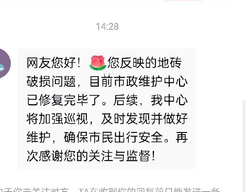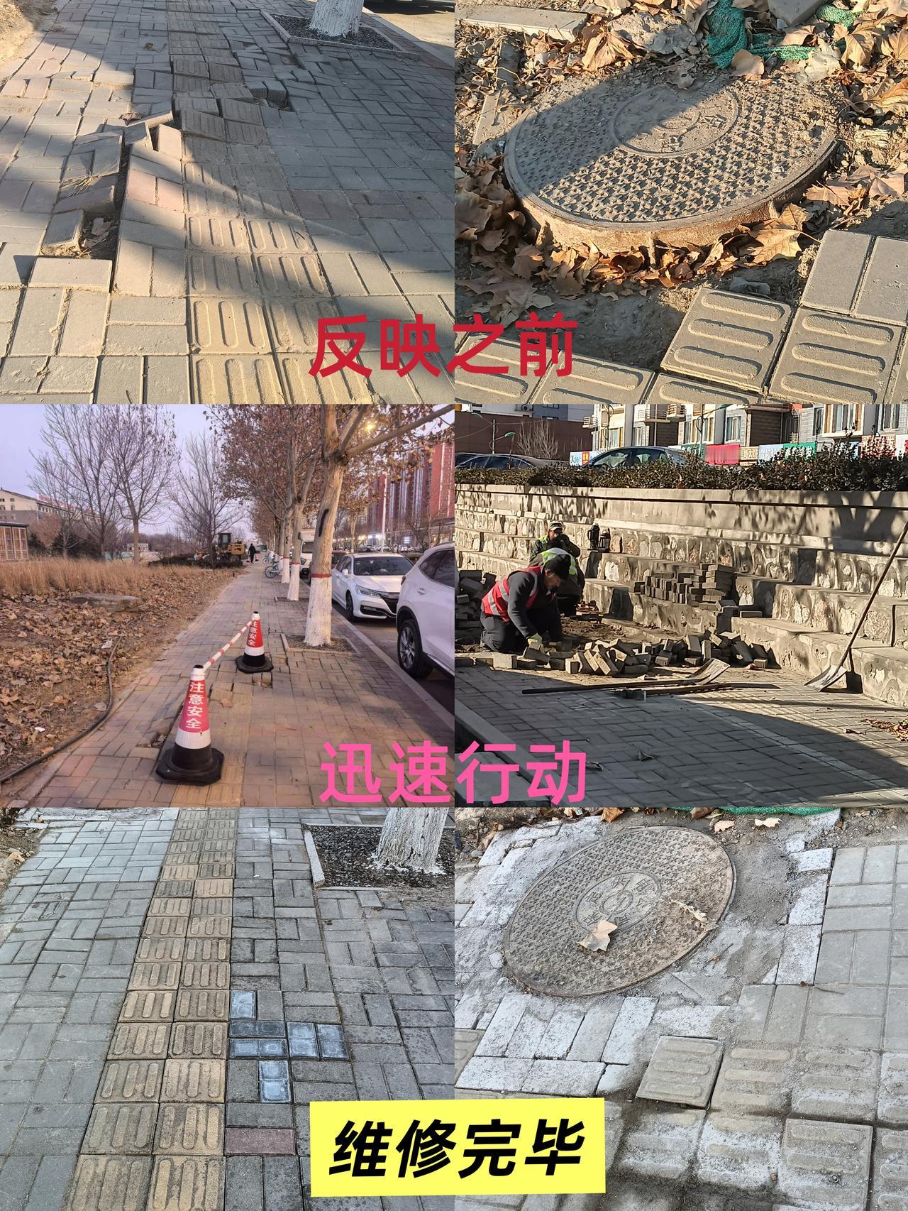 网上诉求速响应,破损地砖速修复!为保定市政维护中心点赞! “刚在网上反映完人行道地砖破裂,没想到保定市政维护部门这么快就来维修了!”真心对保定市政维护中心的高效服务连连点赞。[赞] 1月6日,我在保定莲池区三丰东路窑上村花卉市场对过的人行道辅路行走时,发现人行道多块地砖松动破裂,地砖散落一地,鼓起了大包,还有老人被绊倒,不仅影响市容,还存在出行安全隐患,便通过今日头条网络平台反馈情况。没想到发出仅一个多小时,市政部门就迅速启动快速响应机制,当天便组织人员抵达现场勘查,拉上安全警戒线,三天之内便开展修复作业。施工人员严格按标准清理破损地砖、平整基层、铺设新砖,高效完成修复工作,让破损路面焕然一新。 此次维修彰显了市政维护部门“民生无小事”的服务理念,快速响应、务实处置的工作作风,既解决了群众出行难题,也拉近了与市民的距离。这样的高效服务真正把实事办到了心坎上。@保定城管 @保定日报 @纵览新闻