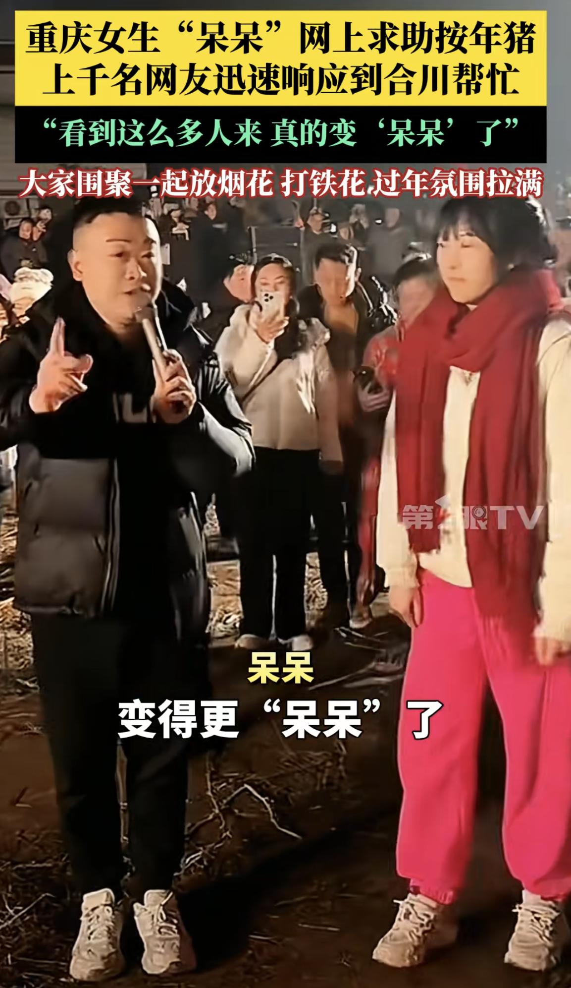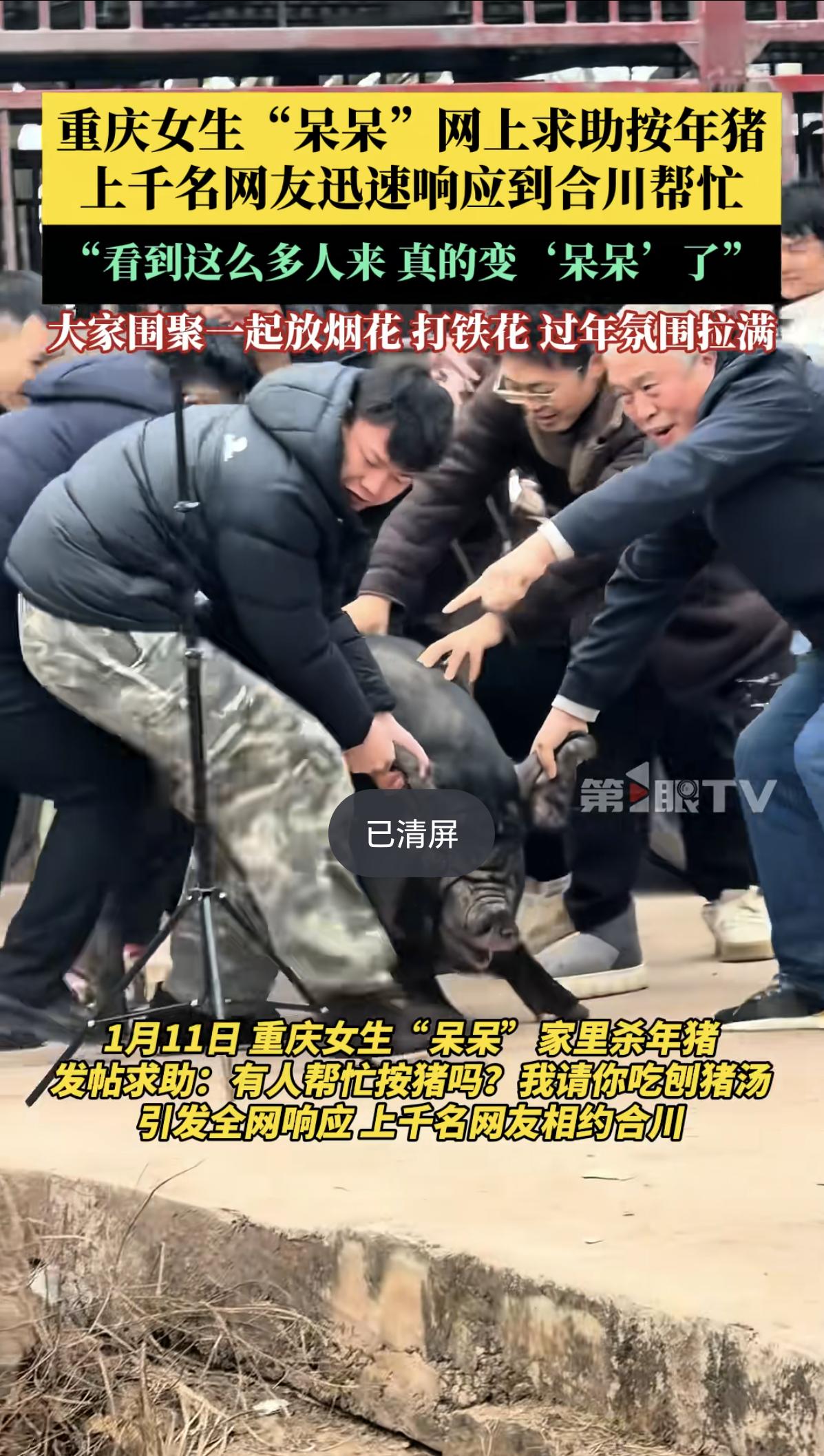 合川杀年猪名场面:四方都乐了,就猪遭了殃! 谁能想到,咱们重庆合川姑娘呆呆妹的一句“求帮忙按年猪”,能闹出这么大动静!这场意外的年味狂欢里,呆呆妹、网友、合川文旅、现场来的人全都笑开了花,唯独那5头猪,属实是“天塌了”。[笑哭] 呆呆妹绝对是最大赢家,原本粉丝不足500,如今暴涨20万,直播间峰值10万人在线,礼物收到手软,半天收入够买好几头猪,还成了合川文旅特邀嘉宾,妥妥的“泼天富贵”砸身上。 网友们更是乐在其中,从渝川黔粤各地赶来,4000人挤在村口,蹲田埂上吃刨猪汤都吃得香。自发烧水切菜、凑着看热闹,晚上还有打铁花、篝火晚会,比过年还热闹,这份乡土烟火气让都市人直呼“过瘾”。 合川文旅堪称“救场天花板”,凌晨2点扛着猪赶来支援,不仅解了食材危机,还带火了钓鱼城景区和合川桃片,酒店订单暴涨300%。说实话,这波流量吃得明明白白。 唯独最惨的就是那5头猪了!原本呆呆家只计划杀2头,结果架不住人多,文旅补2头、网友捐1头,硬生生凑够5头才撑住流水席。 从按猪到下锅,全程沦为“流量工具猪”,只能说这波年味,是猪用“身价”换回来的呀!
