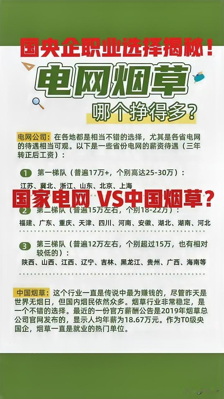 大学生在国企上班有前途吗? 国家电网和烟草哪个更有前途?选择工作稳定,还是选择薪资高?一图读懂,速速收藏起来备用!先说说国家电网的岗位,这个区域差距太大了,按照第一梯队,富裕地区的电网,年收入在17万左右,高的可以达到在25~30万!第二三梯次,由于地区经济差异,岗位薪资会有大幅度的降薪。那么中国烟草体系,主要是业务垄断,需求非常多,岗位就是稳定福利好!你觉得国家电网和烟草哪个更适合职业规划,各有哪些优势?速速围观揭秘详细内容![点亮平安灯][点亮平安灯][烟花][烟花] @叮咚云 将优先为粉丝职业规划指导,1对1咨询是付费服务,为你定制最适合的就业择业方案!欢迎留言交流讨论。[来看我][来看我] 免责声明:图片来自网络,仅供参考! 央国企求职
