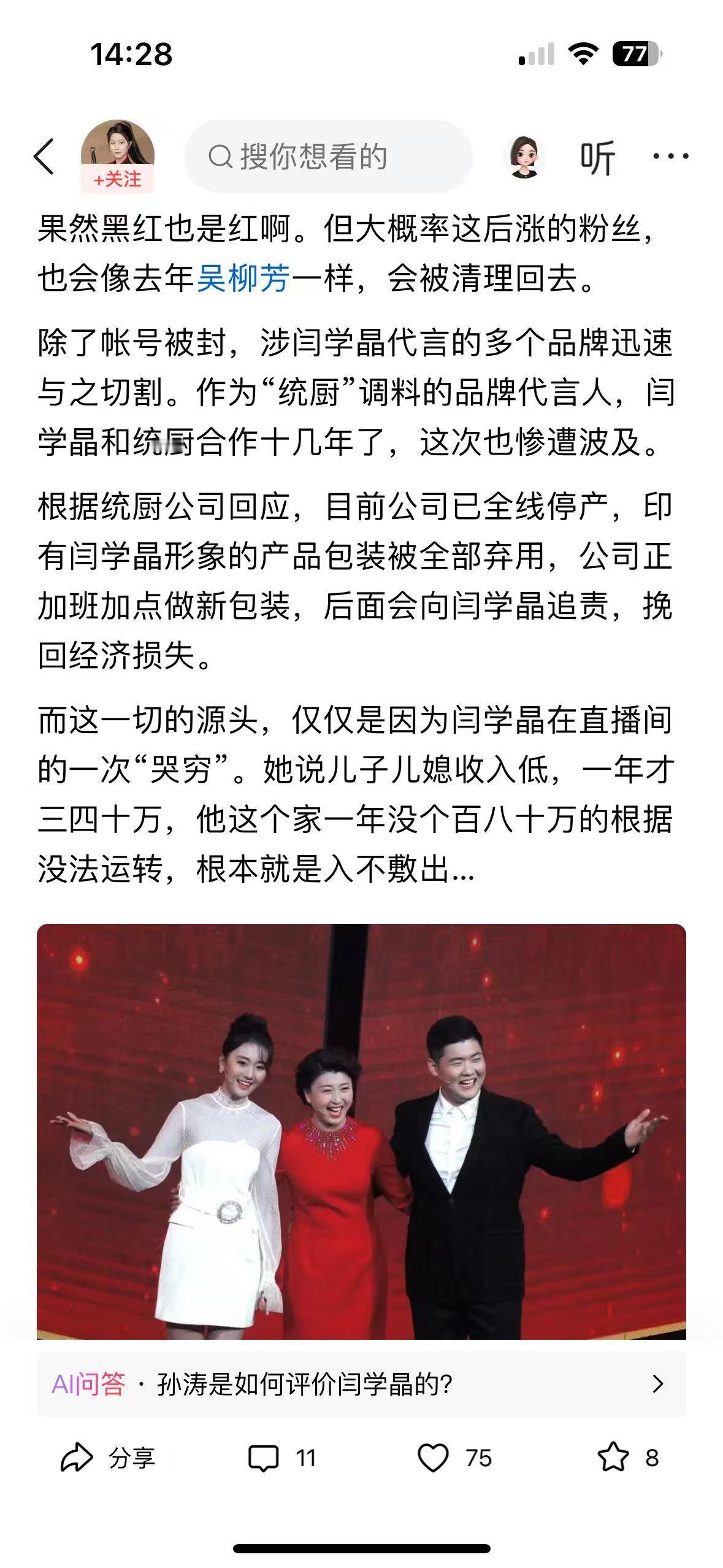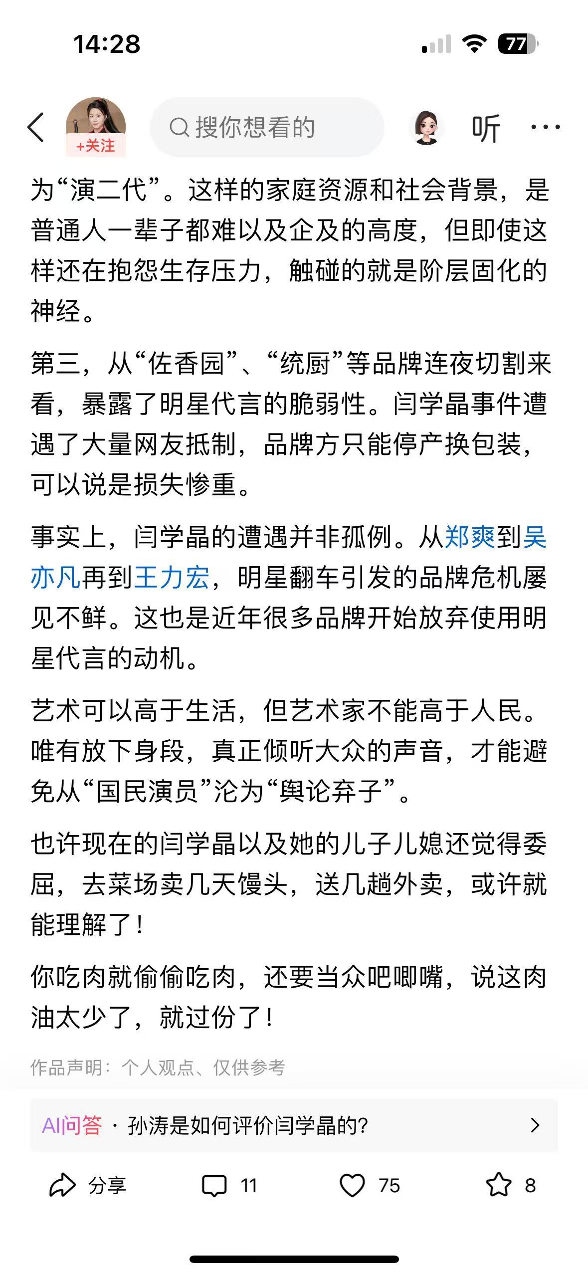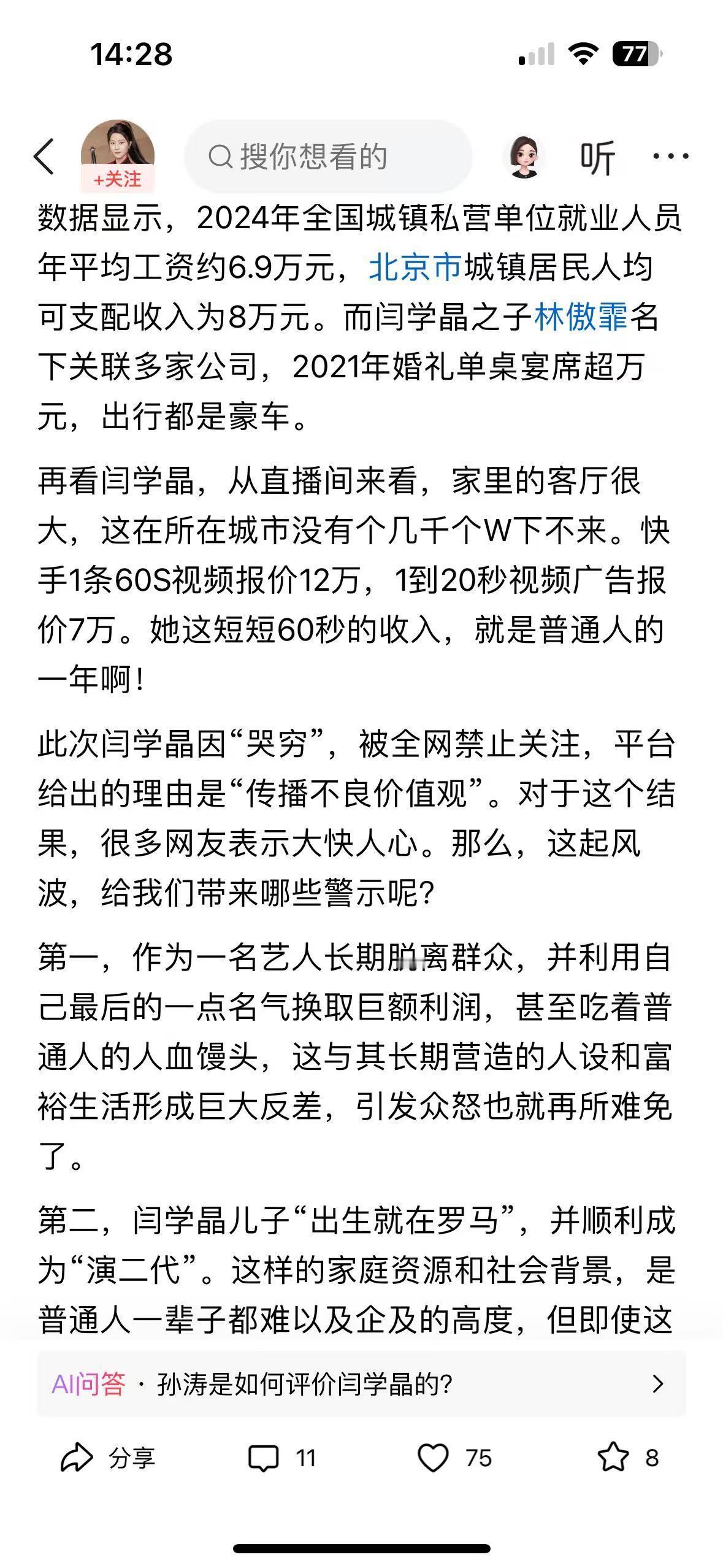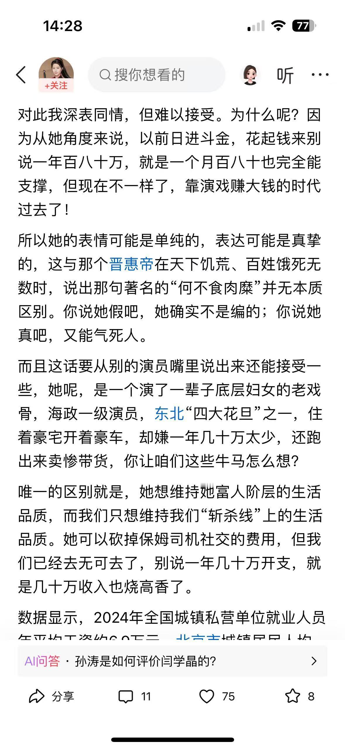 读完这篇文章,心里满是共情与愤懑。闫学晶住着豪宅、60 秒视频报价 12 万,却抱怨儿子年入三四十万不够花,全然无视普通人年入几万的挣扎,这种脱离群众的 “哭穷” 太扎心。 她演了一辈子底层妇女,却早已忘了底层的艰辛,拿着普通人遥不可及的收入卖惨,难怪会因传播不良价值观被禁关注。 文章戳中了阶层差异的痛点,也让人明白:艺人若丢了初心、脱离人民,再大的名气也会翻车。这种 “吃肉还吧唧嘴” 的矫情,实在让人无法共情。