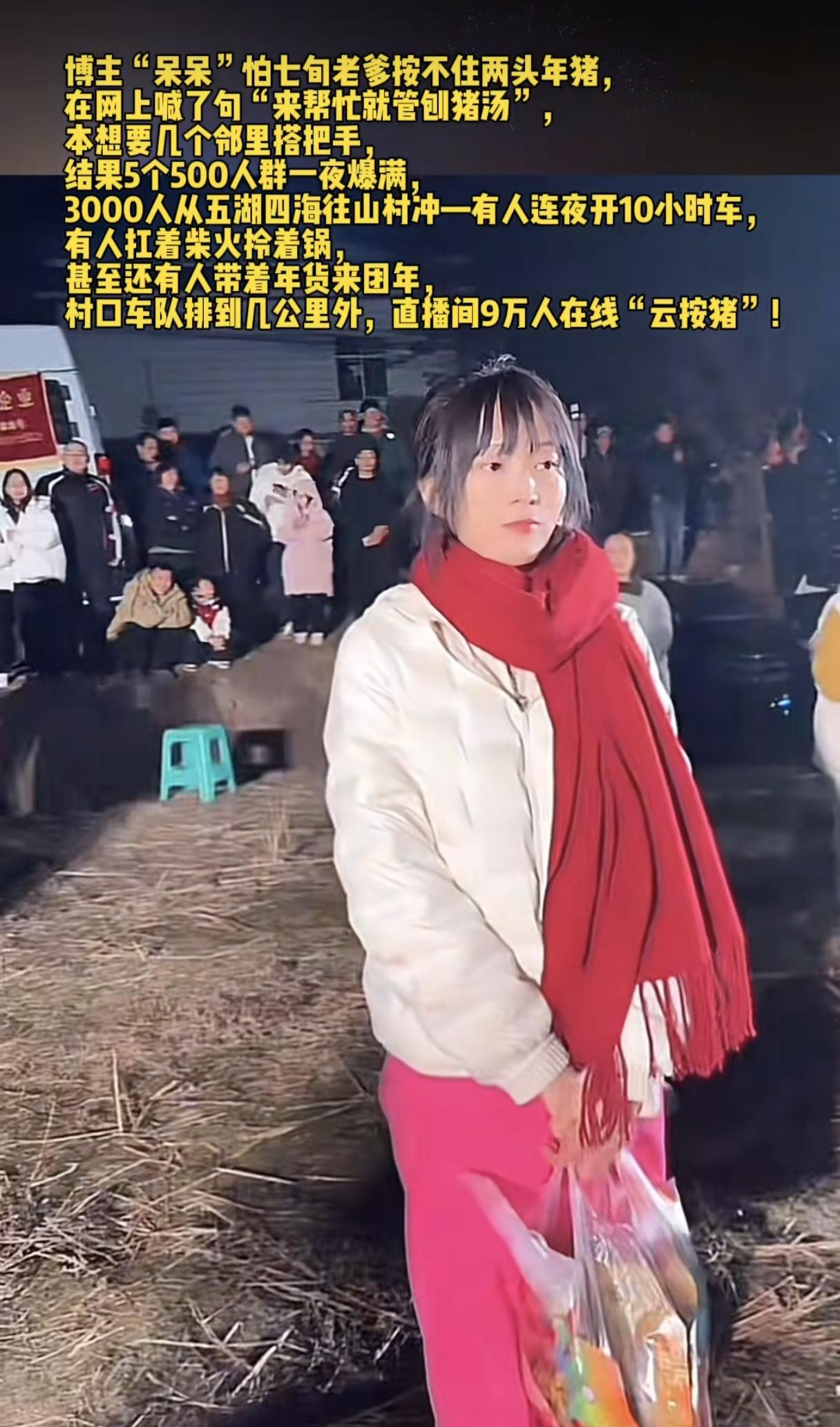 呆呆要吓哭了!发现视频火的那天,马上打电话给爸爸问:“如果两头猪被我的朋友吃完了,你会不会说什么?”她爸爸回复:“这么多怎么吃的完?”呆呆再次肯定的说:“就是吃被吃完了该怎么办?”爸爸说:“吃完就吃完了呗!” 估计呆呆爸爸怎么也不会想到,呆呆的朋友一下来了5000人左右。 呆呆讲述,父母一睁眼都傻了,两人坐在二楼,妈妈是都没去过城里,从来没见过这样的场面。 来的朋友也很给力,大家都没有空手来,带的礼品都堆成山了,还有网友带着5头猪前往。 还好有合川文旅兜底,不仅赞助2头猪,还帮着主持,帮着维持现场。 12日的直播中,呆呆都快哭了,拜托大家别再来了,因为交通瘫痪了,还惊动了很多政府人员,还有移动、电信的工作人员,现场来更换网线。 呆呆哭诉:本就不富裕的家庭,更加雪上加霜了,自己能力有限,明天就没有活动了。 直播间在线人数持续10万加,现场气氛很嗨,大家一起唱歌蹦迪喝汤,目前,呆呆的粉丝也从1800涨到了78.8万。 网友笑称:全网你是第一个还没红,就办粉丝见面会的呆呆。 但是呆呆一家真的很不错了,换一般人,看见门口来了上百辆车,恐怕早就反悔不干了。