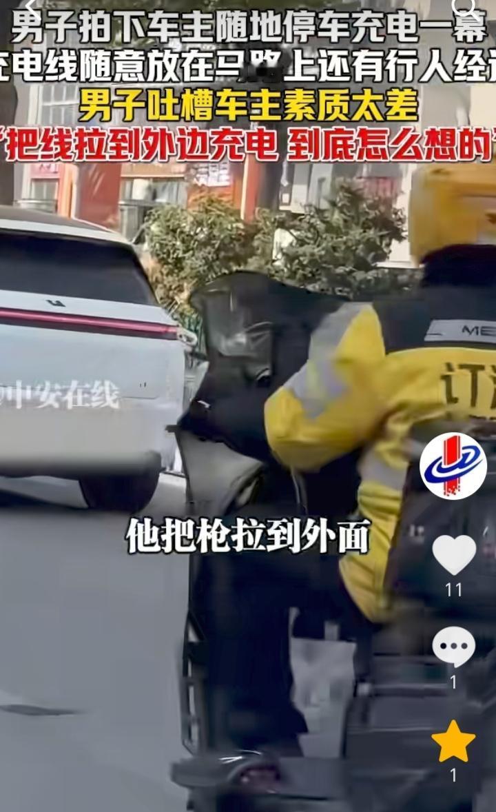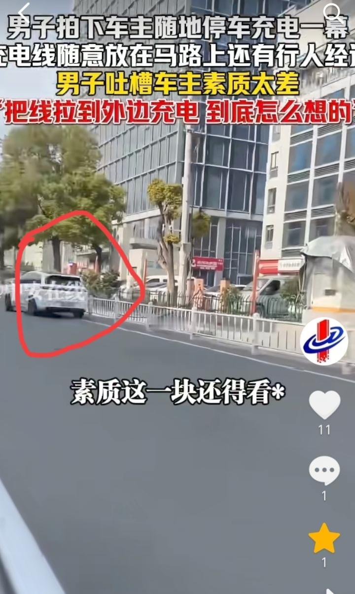 “没素质”!浙江,一充电车主直接把车停在马路上充电,充电桩在院子里面,车主直接把