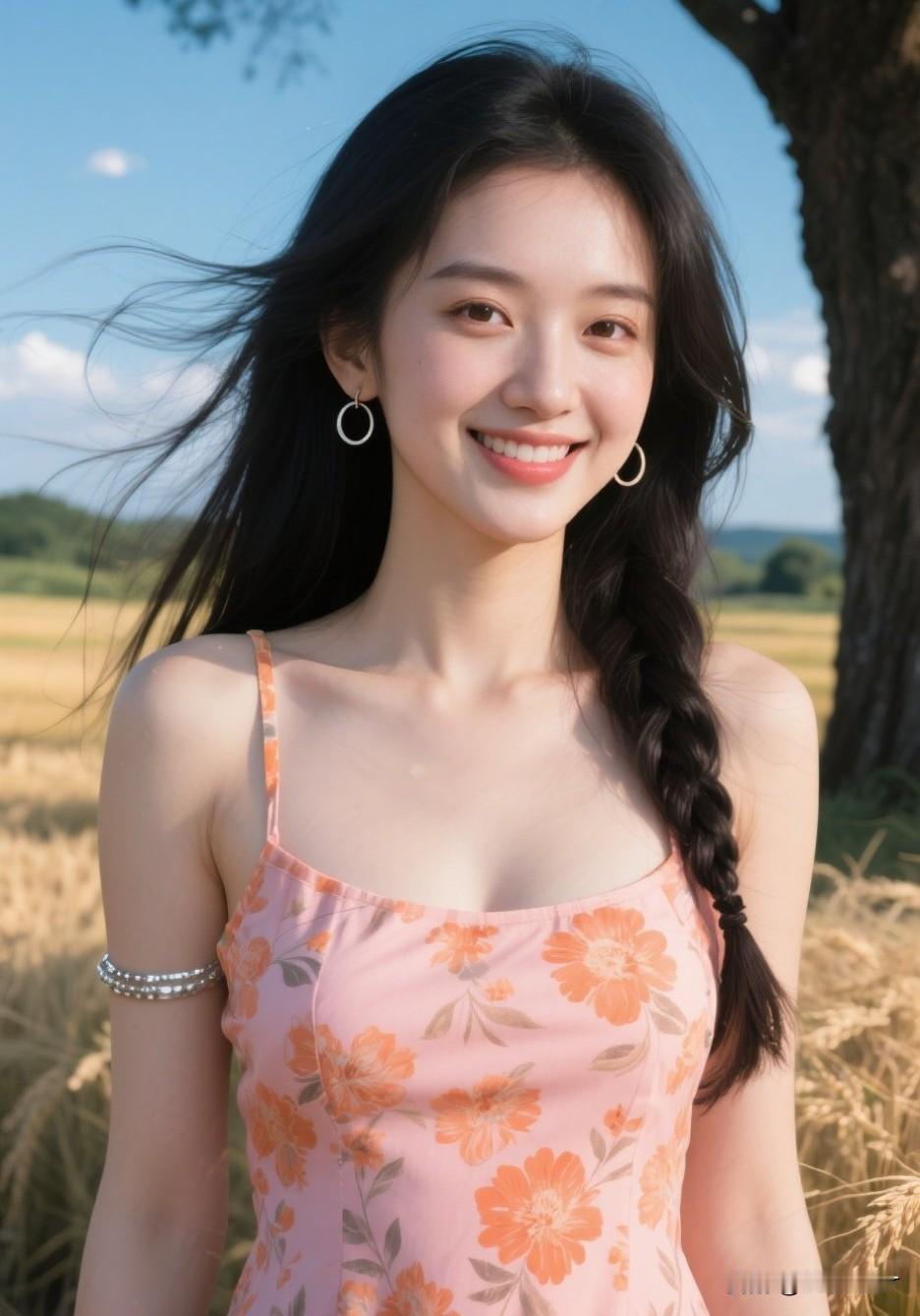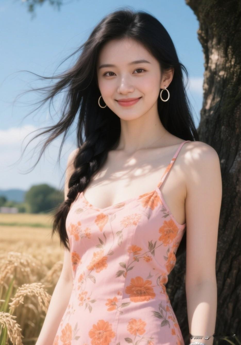 夏日田野中的甜美少女,粉色花裙与金发麦浪相映成趣。